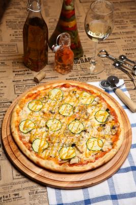 Состав: тесто, помидорная смесь, моцарелла, курица, цукини, шампиньоны, соус карри, масло чесночное, специи