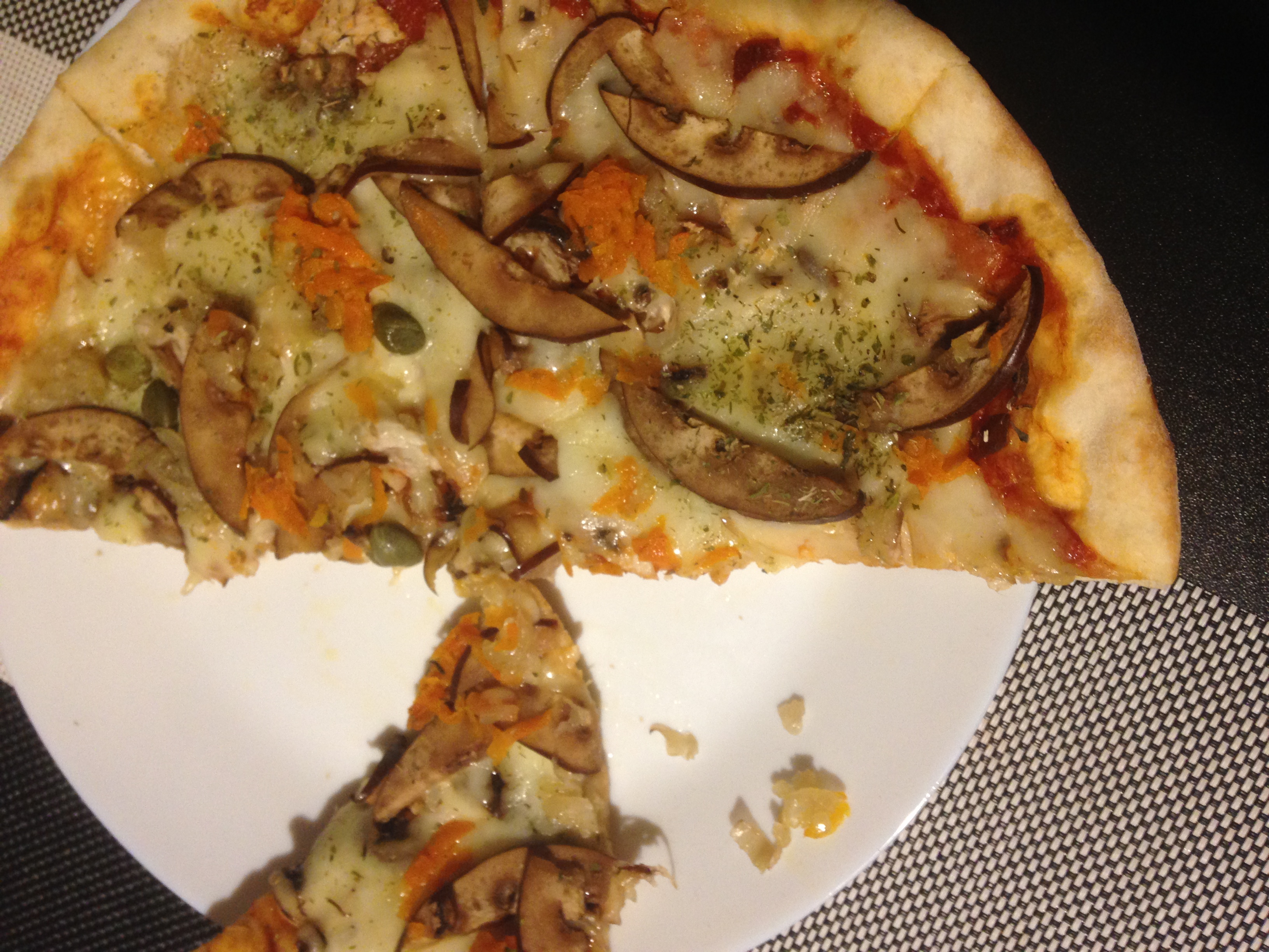 Состав: тесто, помидорная смесь, моцарелла, курица, цукини, шампиньоны, соус карри, масло чесночное, специи