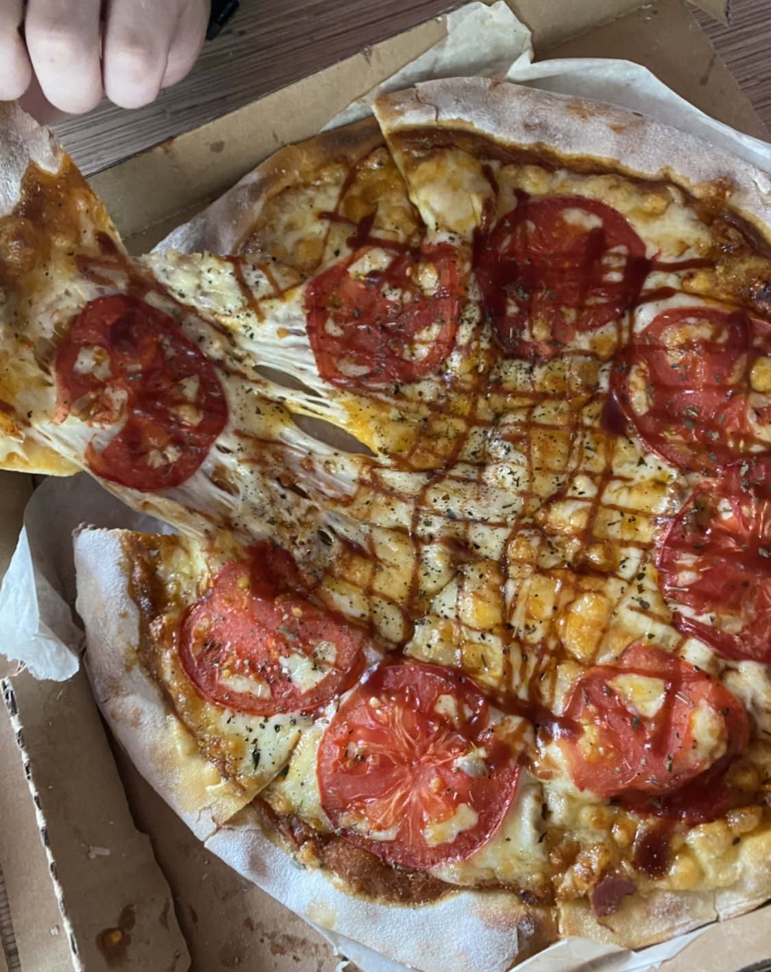 Состав: тесто, помидорная смесь, моцарелла, курица, цукини, шампиньоны, соус карри, масло чесночное, специи