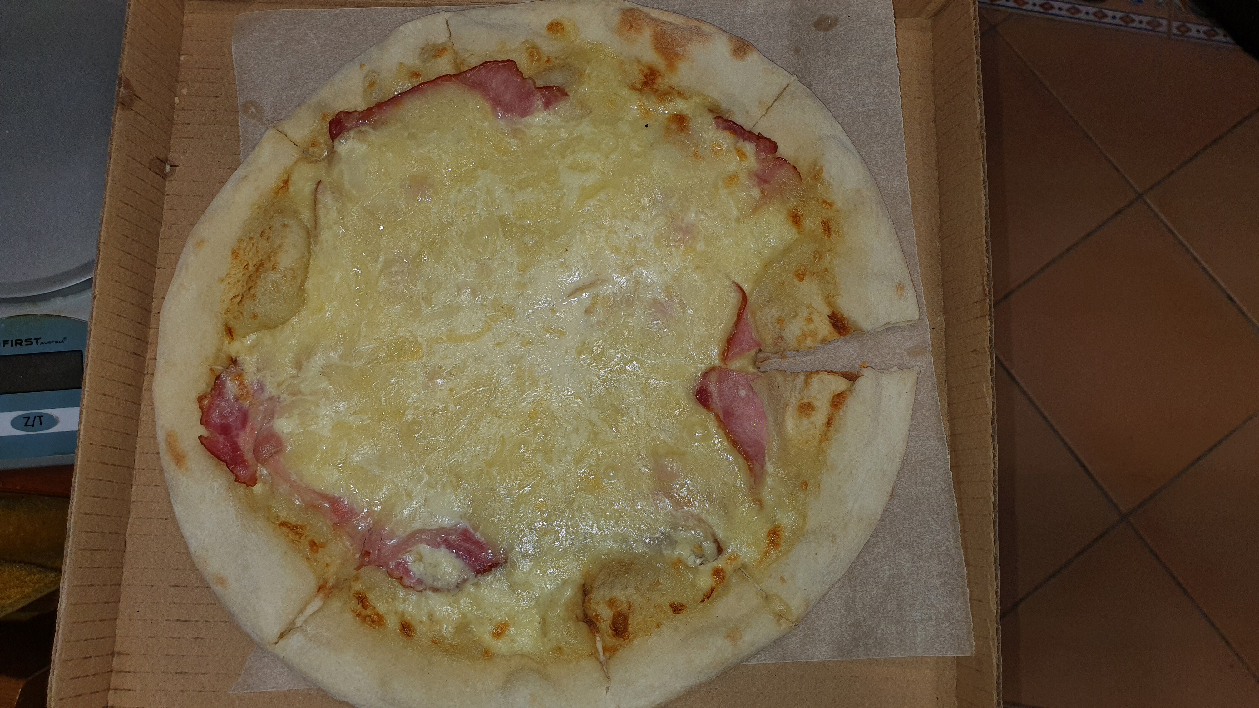 Состав: тесто, соус карбонара, моцарелла, бекон, балык