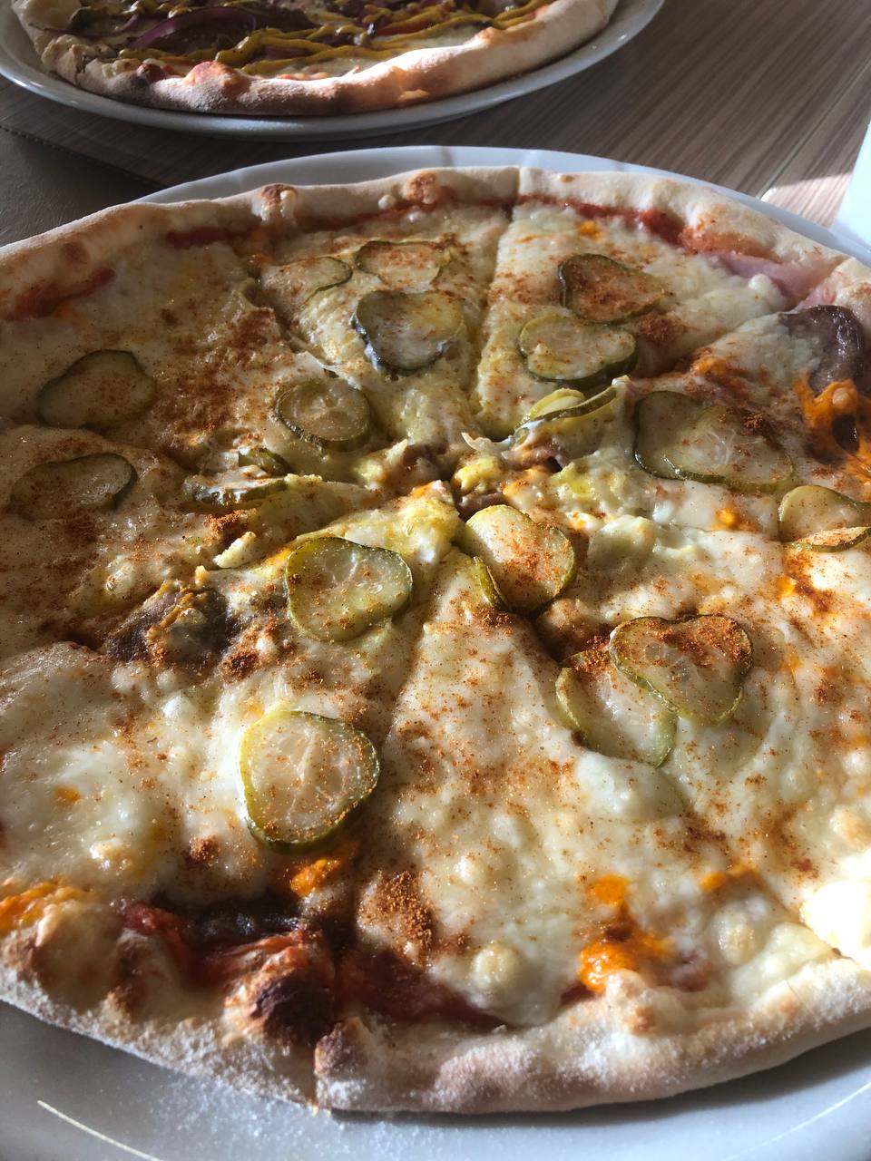Состав: тесто, соус шаурма, моцарелла, курица, шампиньоны, маринованный огурец, томаты