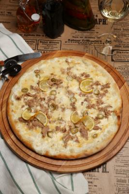 Состав: тесто, соус сливочный, моцарелла, тунец консервированный, оливки, лимон, специи