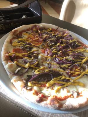 Состав: тесто, помидорная смесь, моцарелла, опята, белые грибы, бекон, огурец маринованный, лук-порей