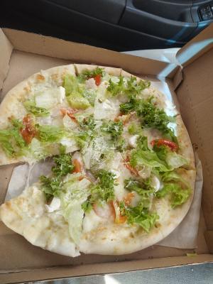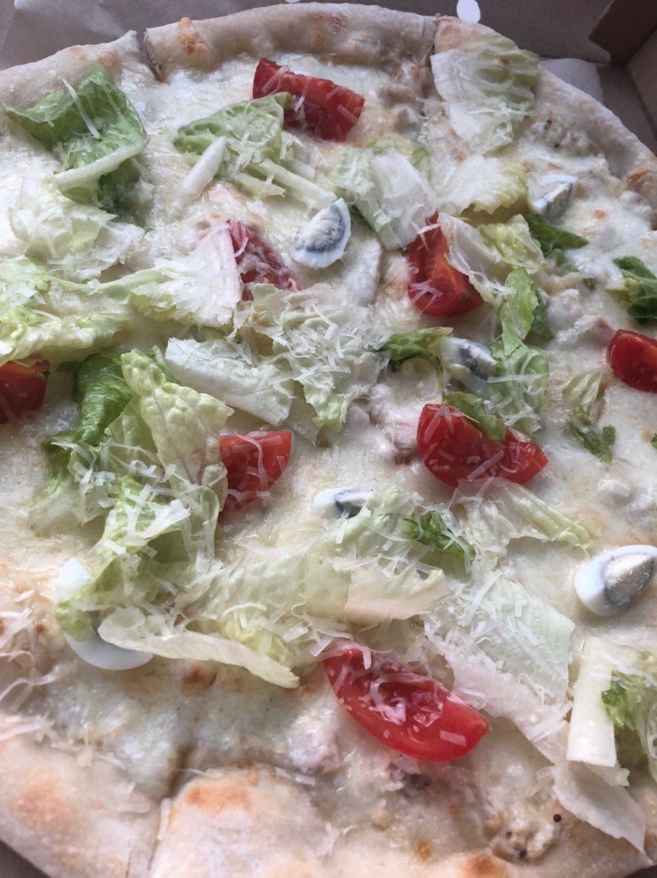 Состав: тесто, соус цезарь, моцарелла, курица, яйцо перепелиное, томаты черри, салат, сыр джюгас