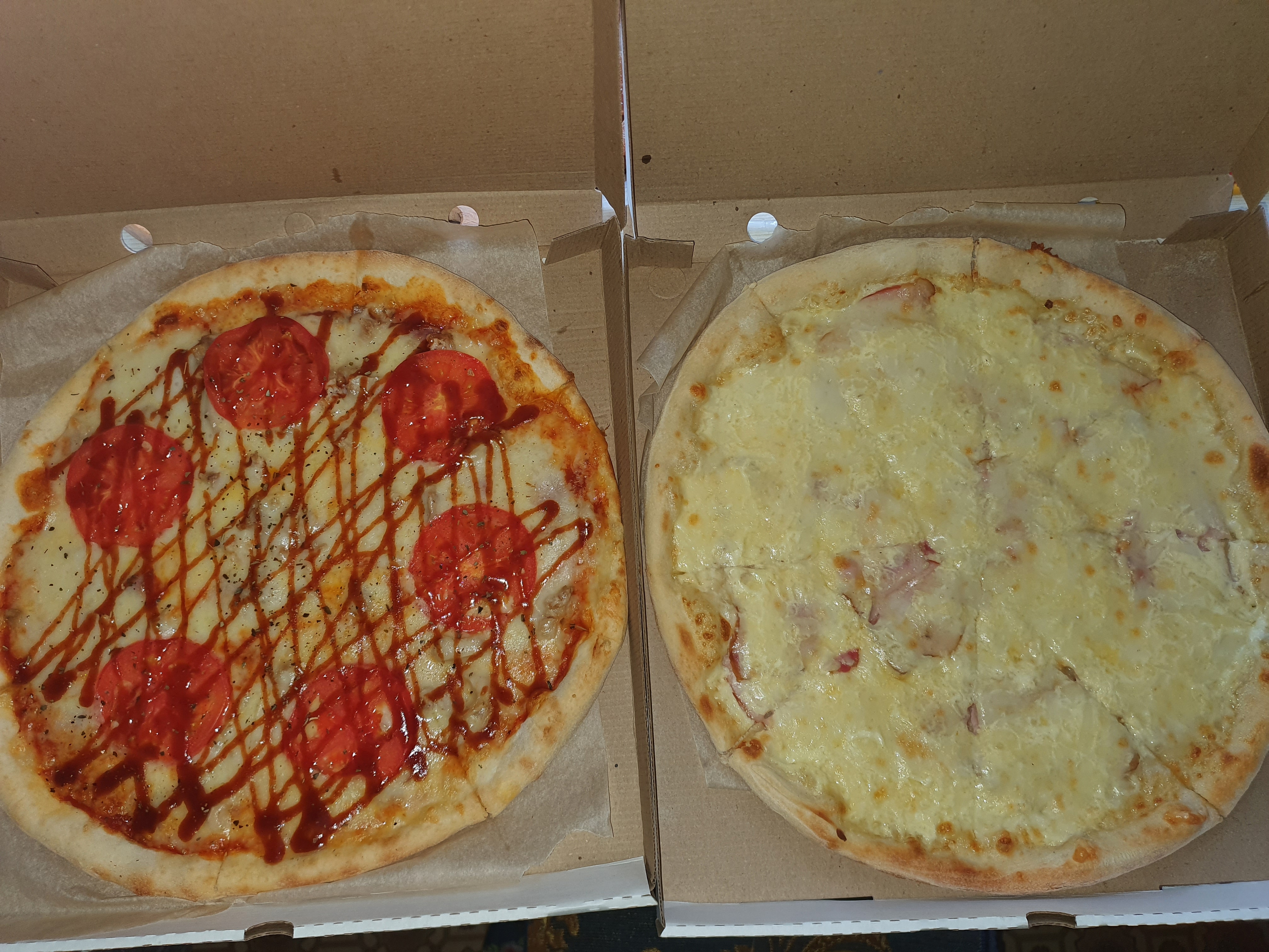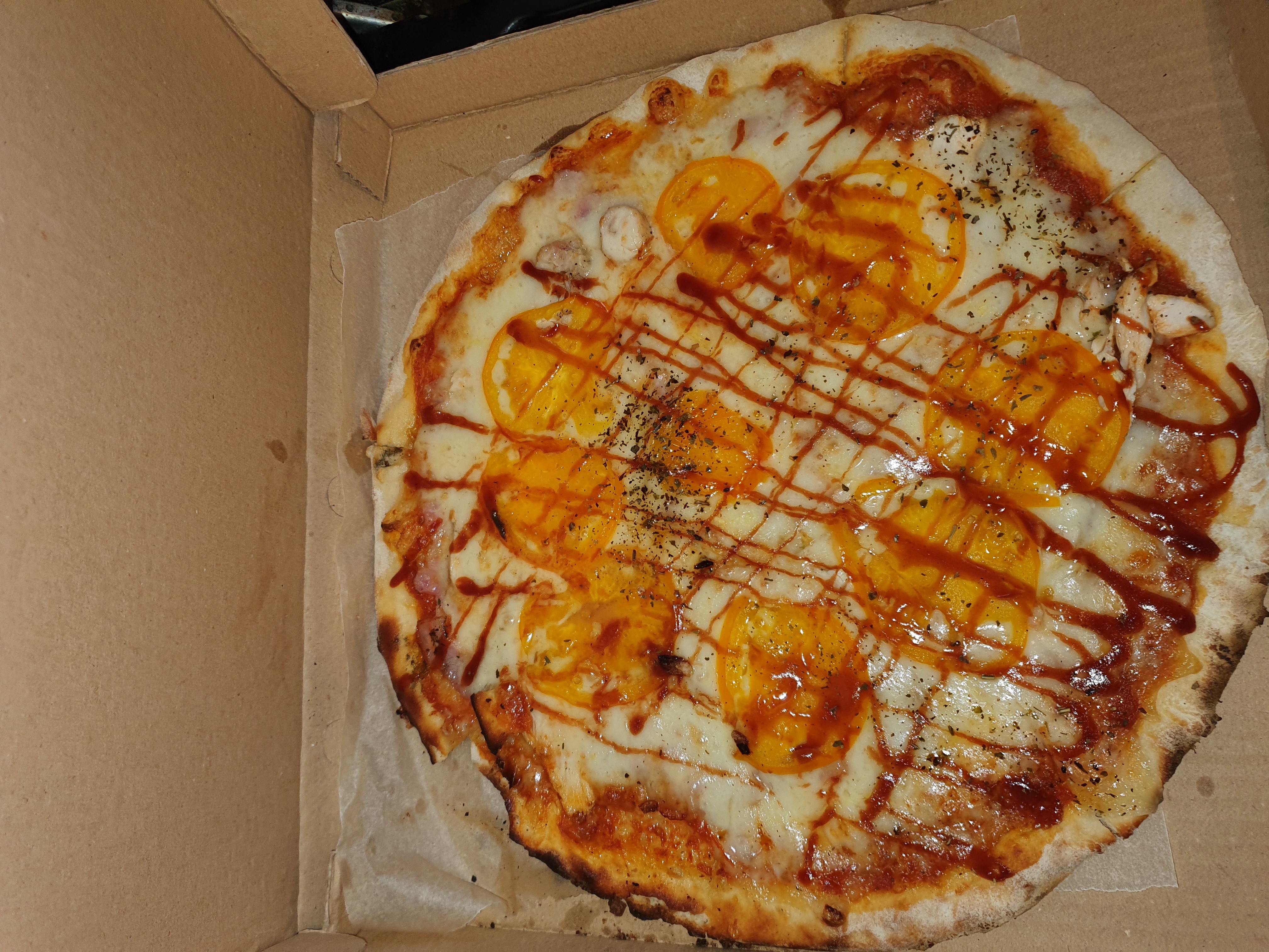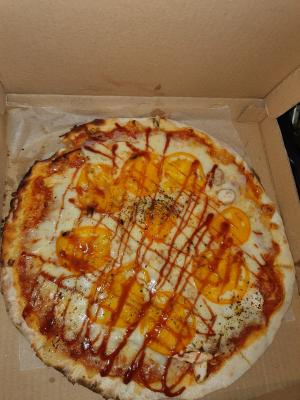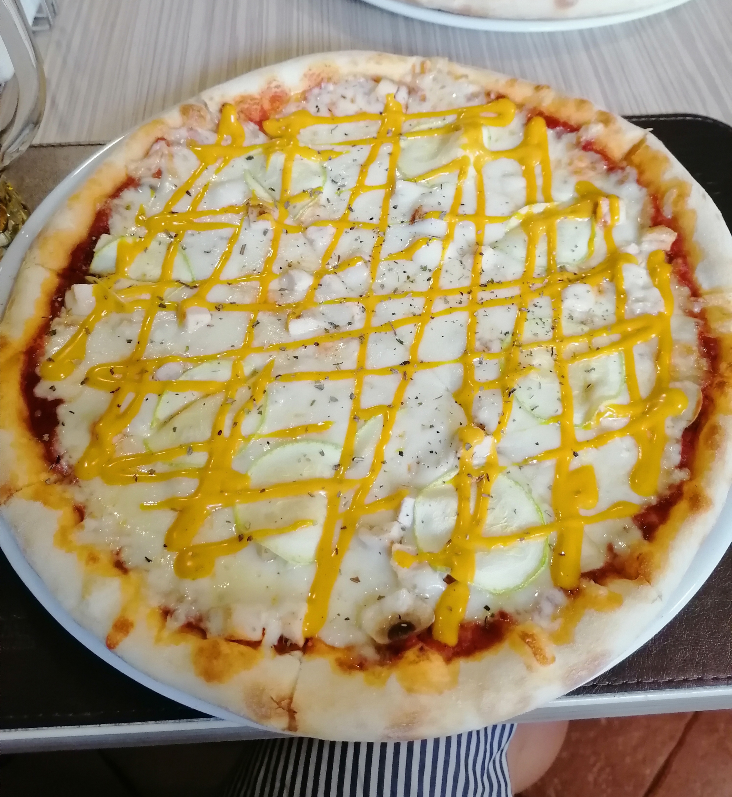 Состав: тесто, помидорная смесь, моцарелла, курица, цукини, шампиньоны, соус карри, масло чесночное, специи
