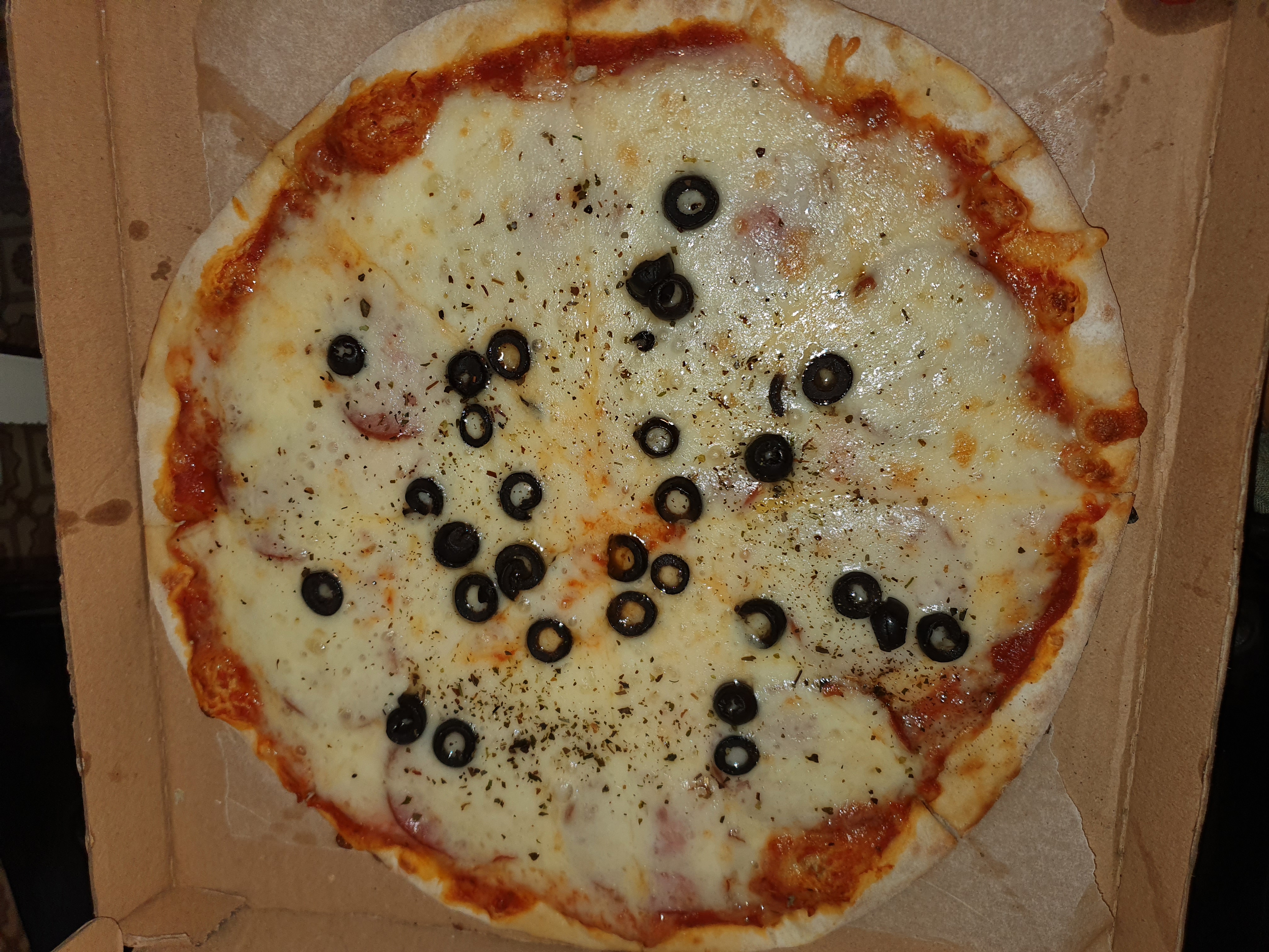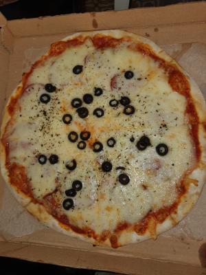 Состав: тесто, помидорная смесь, ветчина, салями, моцарелла, маслины, специи