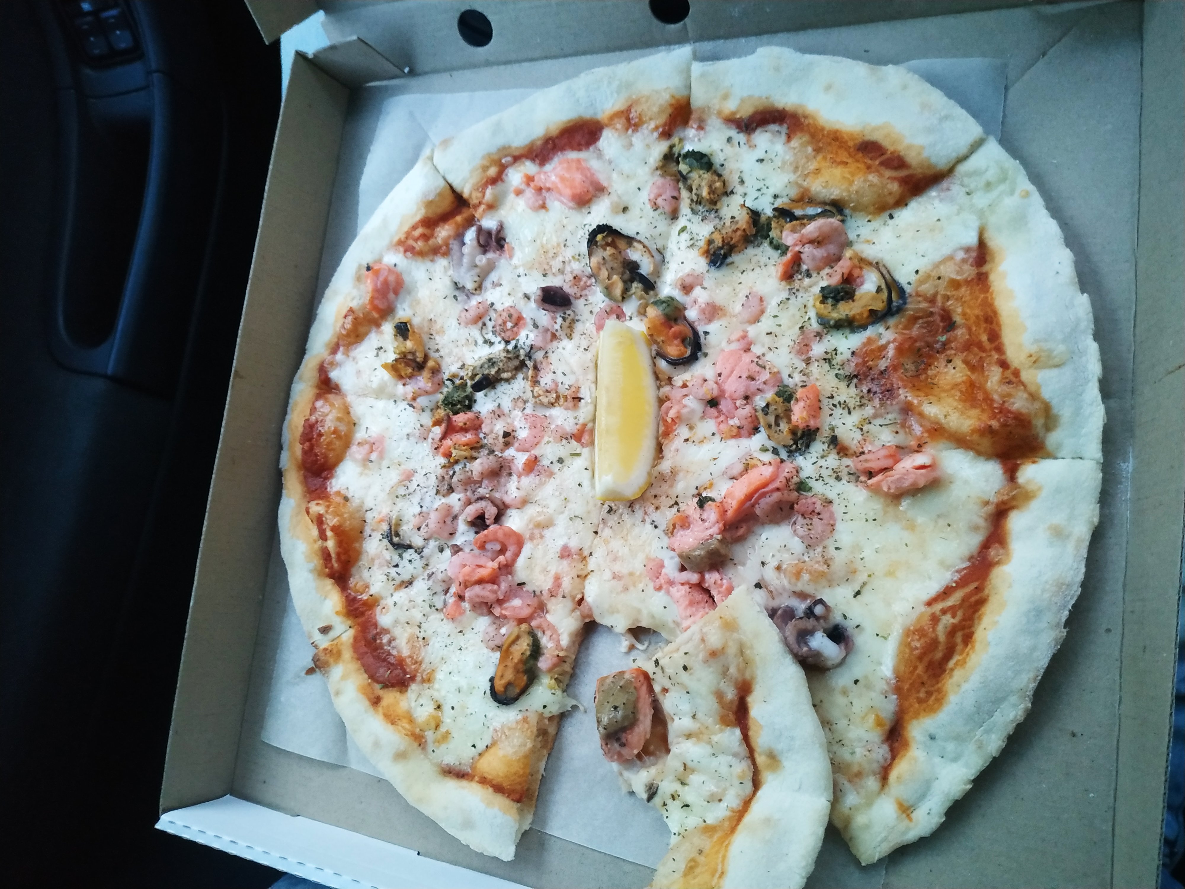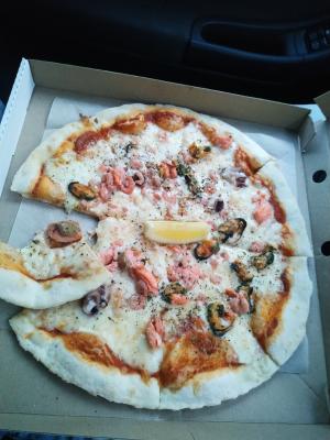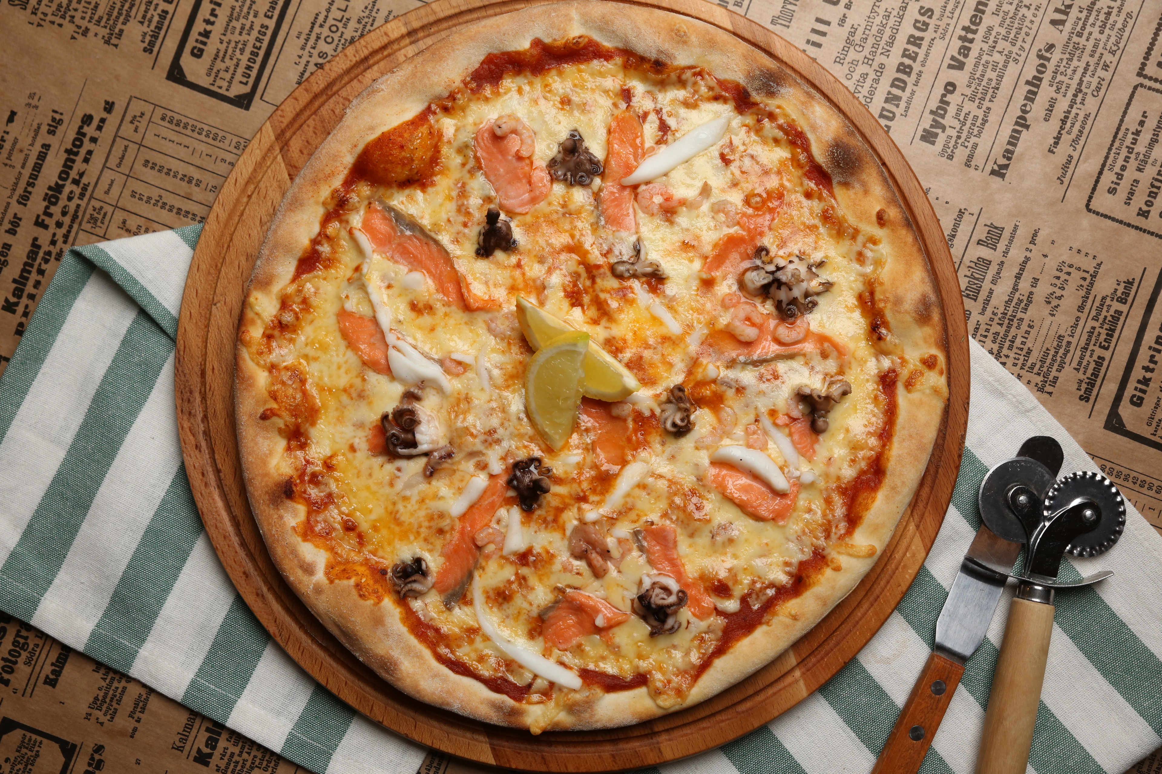Состав: тесто, помидорная смесь, моцарелла, морской коктейль, лосось, лимон, специи