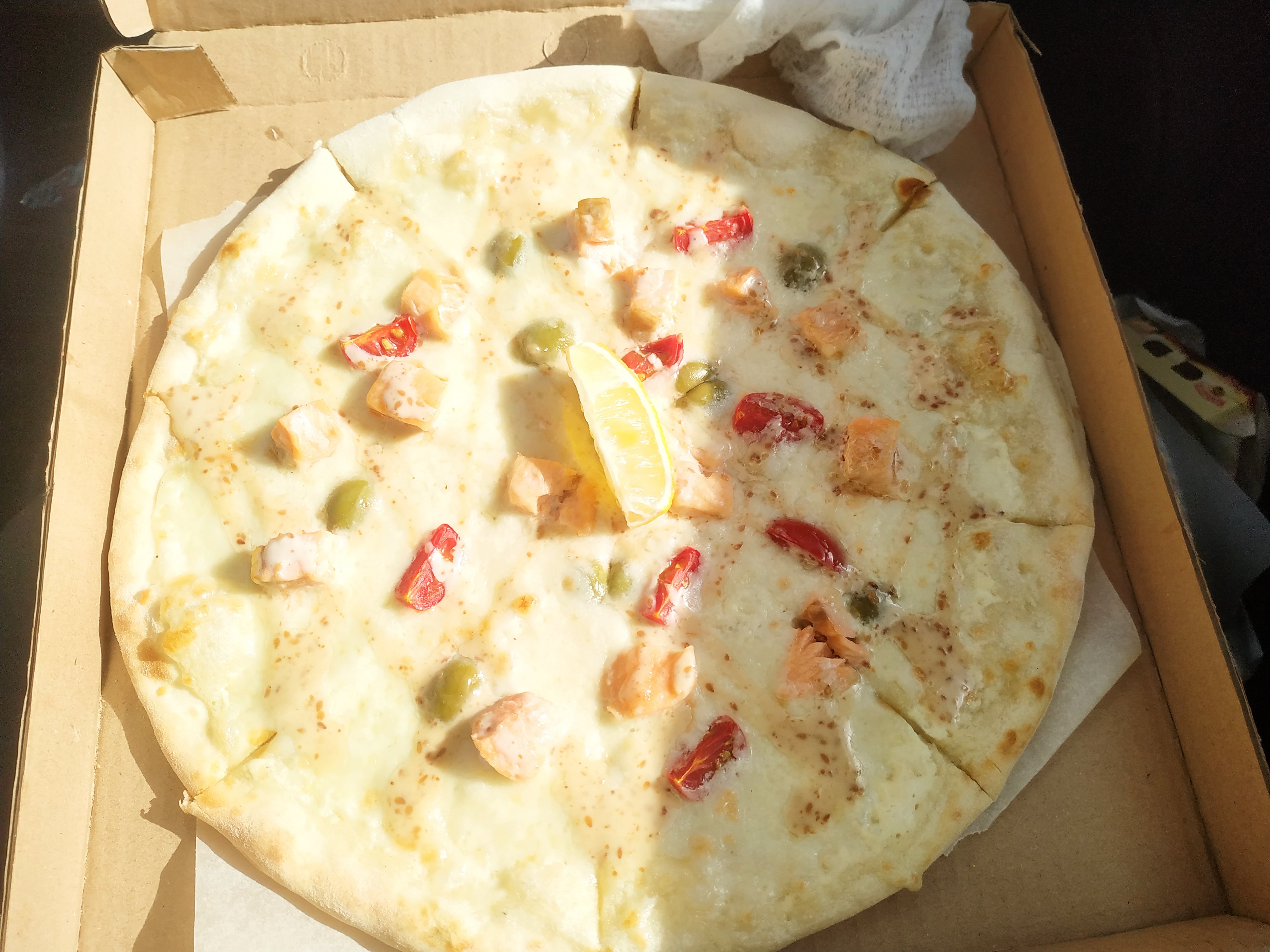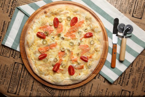 Состав: тесто, соус сливочный, моцарелла, лосось, томаты черри, оливки