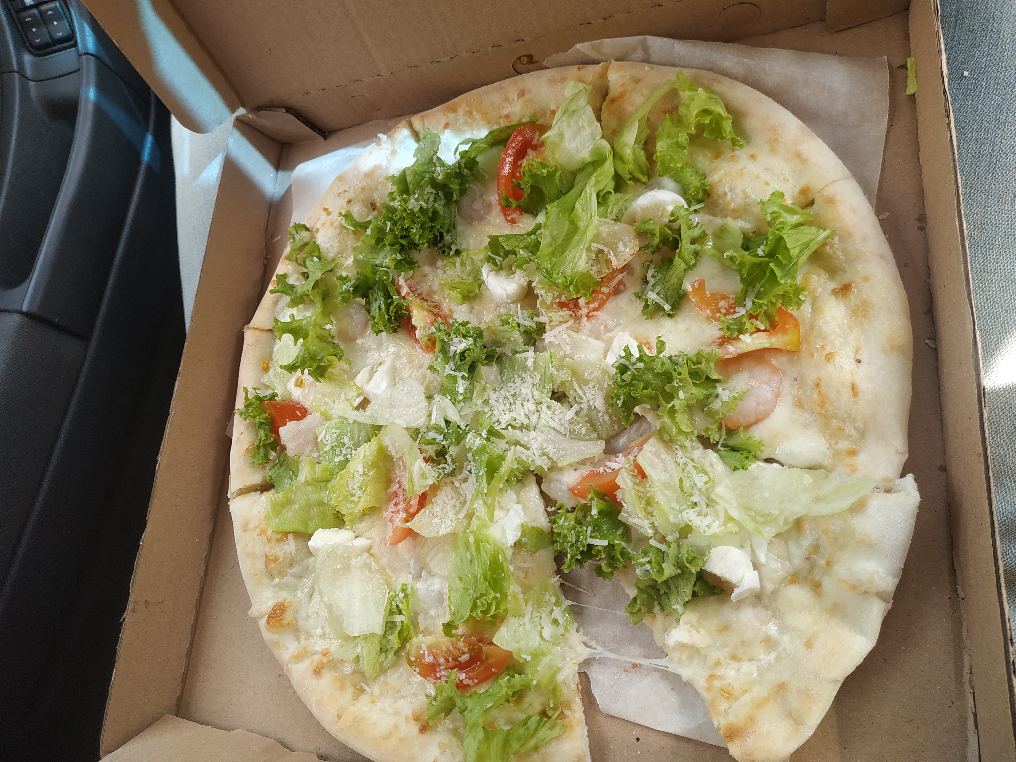 Состав: тесто, соус цезарь, моцарелла, креветки, яйцо перепелиное, томаты черри, салат, сыр джюгас