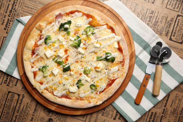Состав: тесто, помидорная смесь, моцарелла, сыр фета, бекон, брокколи, кукуруза, соус чесночный, специи