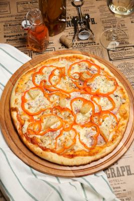 Состав: тесто, помидорная смесь, моцарелла, курица, ветчина, консервированные ананас, перец сладкий, специи