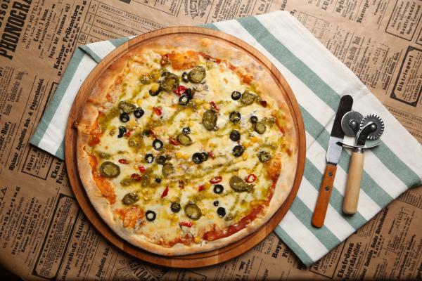 Состав: тесто, соус цезарь, моцарелла, балык, перец чили, перец халапеньо, бекон, кукуруза, соус песто