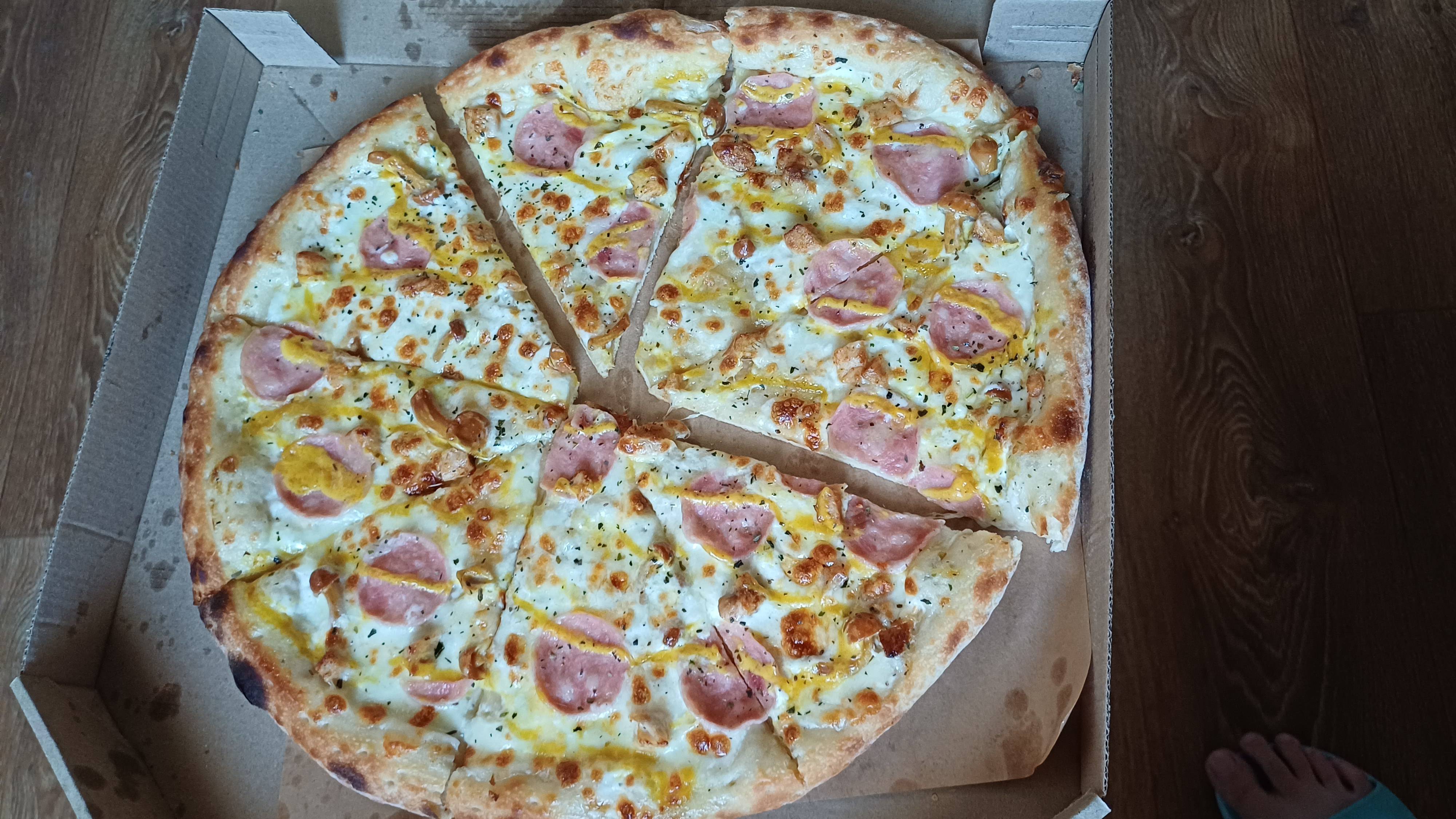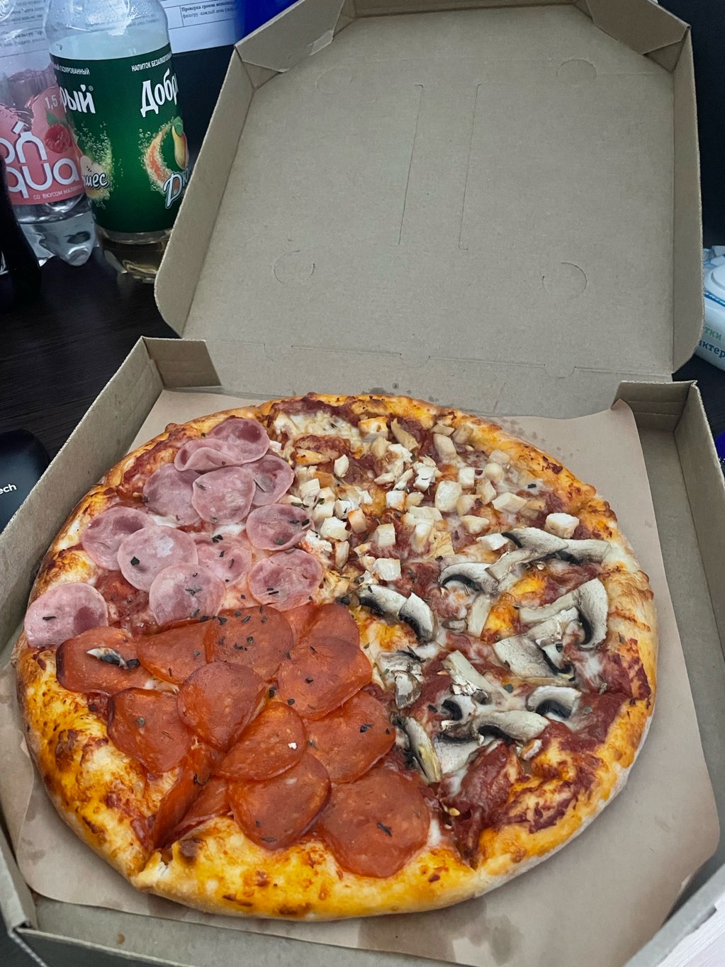 Состав: пицца-соус, куриное филе, сыр моцарелла, пепперони, ветчина, свежие шампиньоны, чесночное масло, базилик
