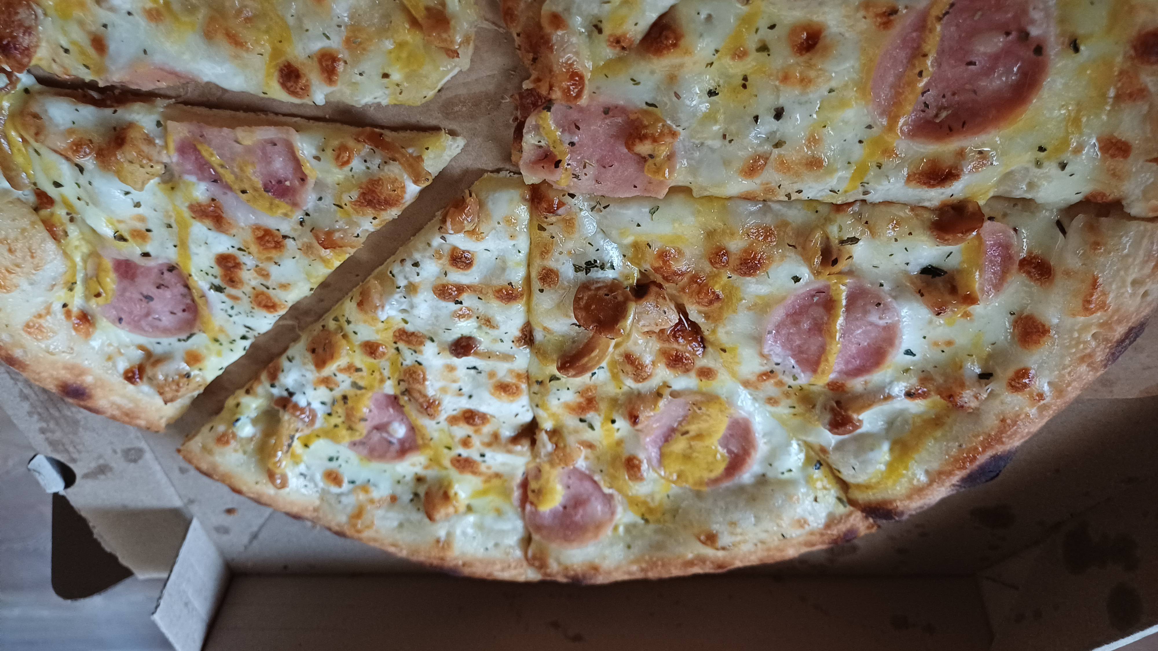 Состав: бургер-соус, сыр моцарелла, ветчина, свежие томаты, перец болгарский, свежий лук, чесночное масло, базилик