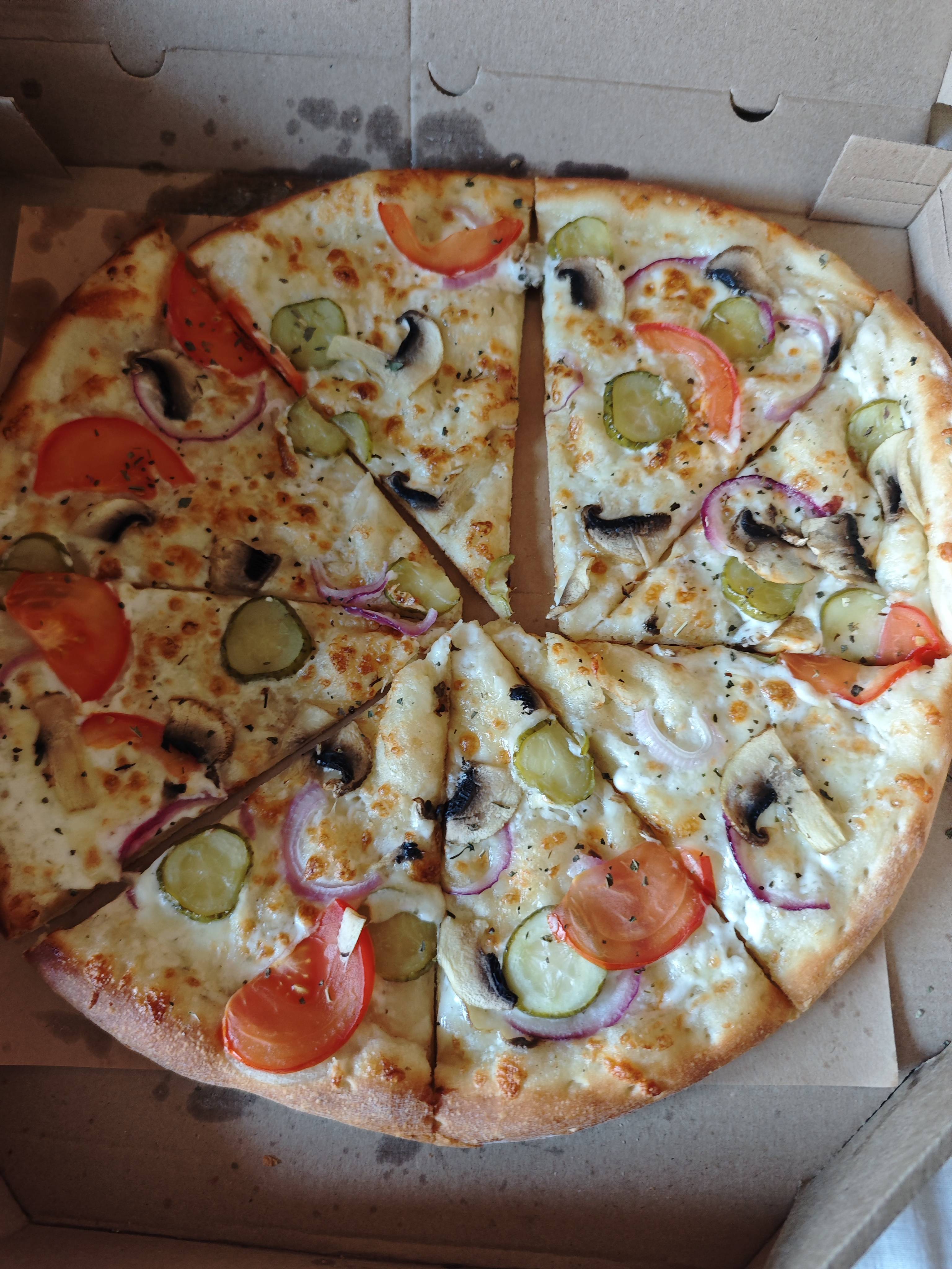 Состав: пицца-соус, сыр моцарелла, свежие шампиньоны, перец болгарский, маслины, свежие томаты, чесночное масло, базилик