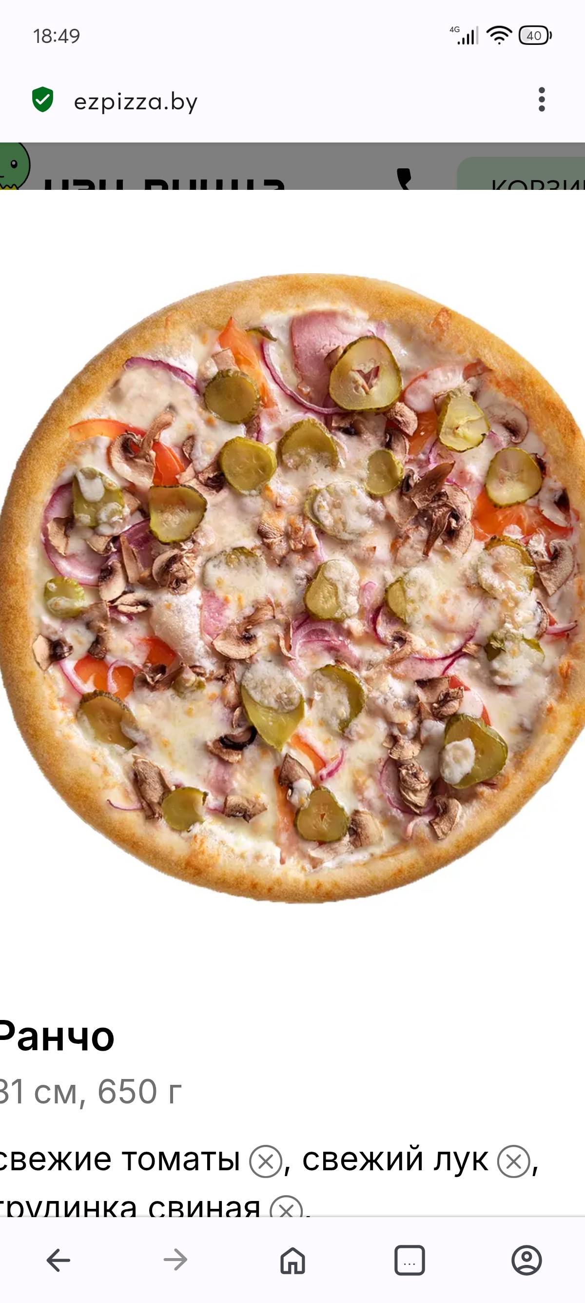 Состав: соус ранч, сыр моцарелла, свежие томаты, свежий лук, грудинка свиная, свежие шампиньоны, маринованные огурцы, чесночное масло, базилик