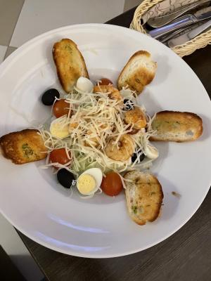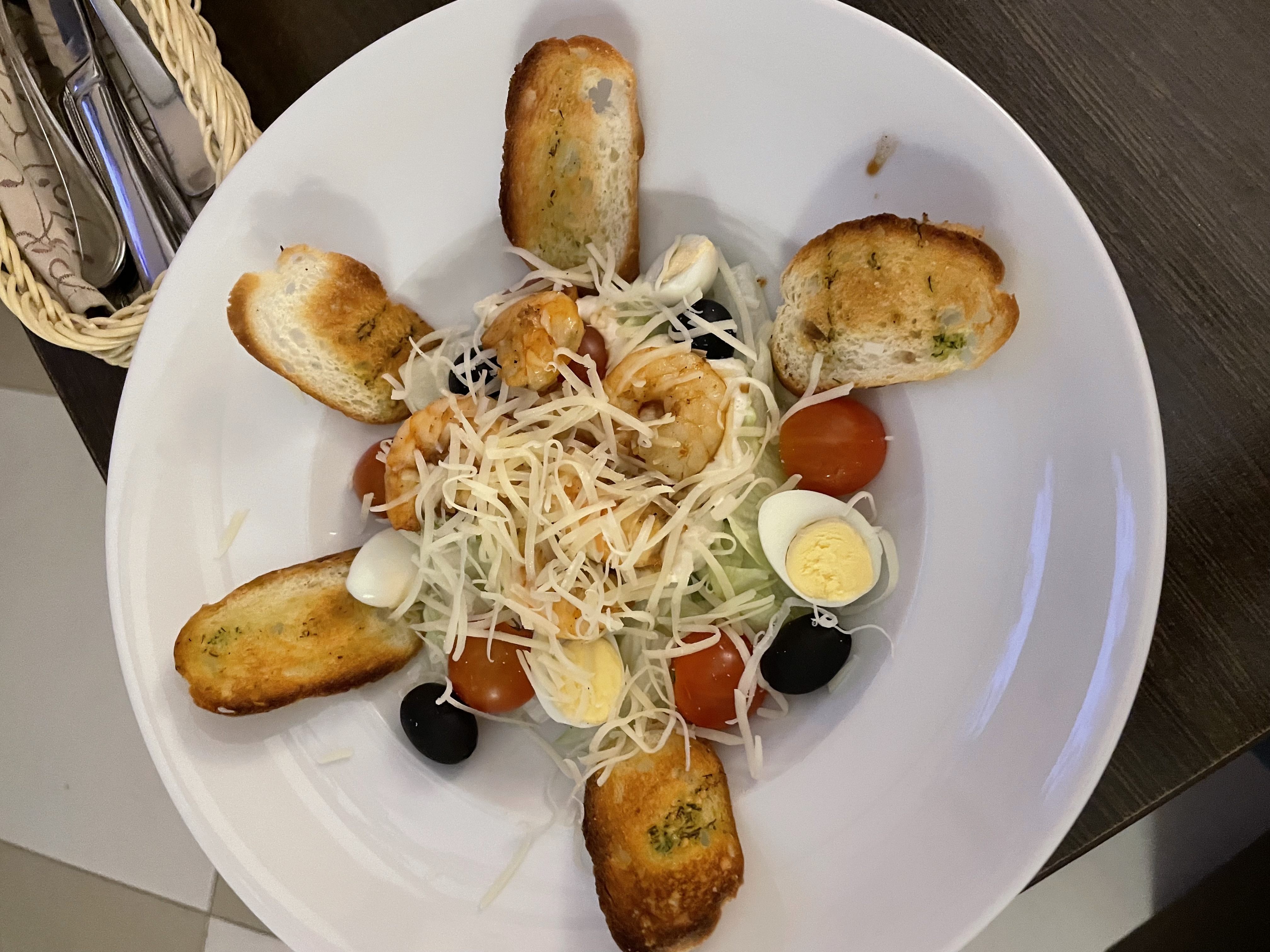 Состав: креветки тигровые, листья салата, черри, яйцо перепелиное, пармезан, маслины, гренки, соус цезарь