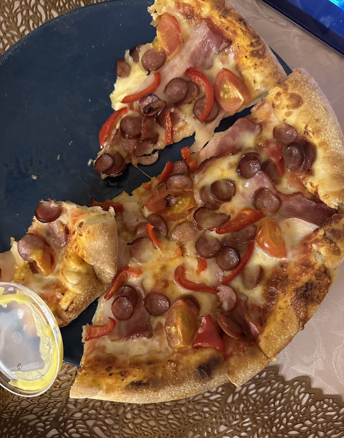 Пицца "Нью Йорк" (640 г) 16,90 р. 26 р. Состав: фирменный соус, моцарелла, бекон к/в, охотничьи колбаски, черри, сладкий перец, перец, халапеньо ![]()