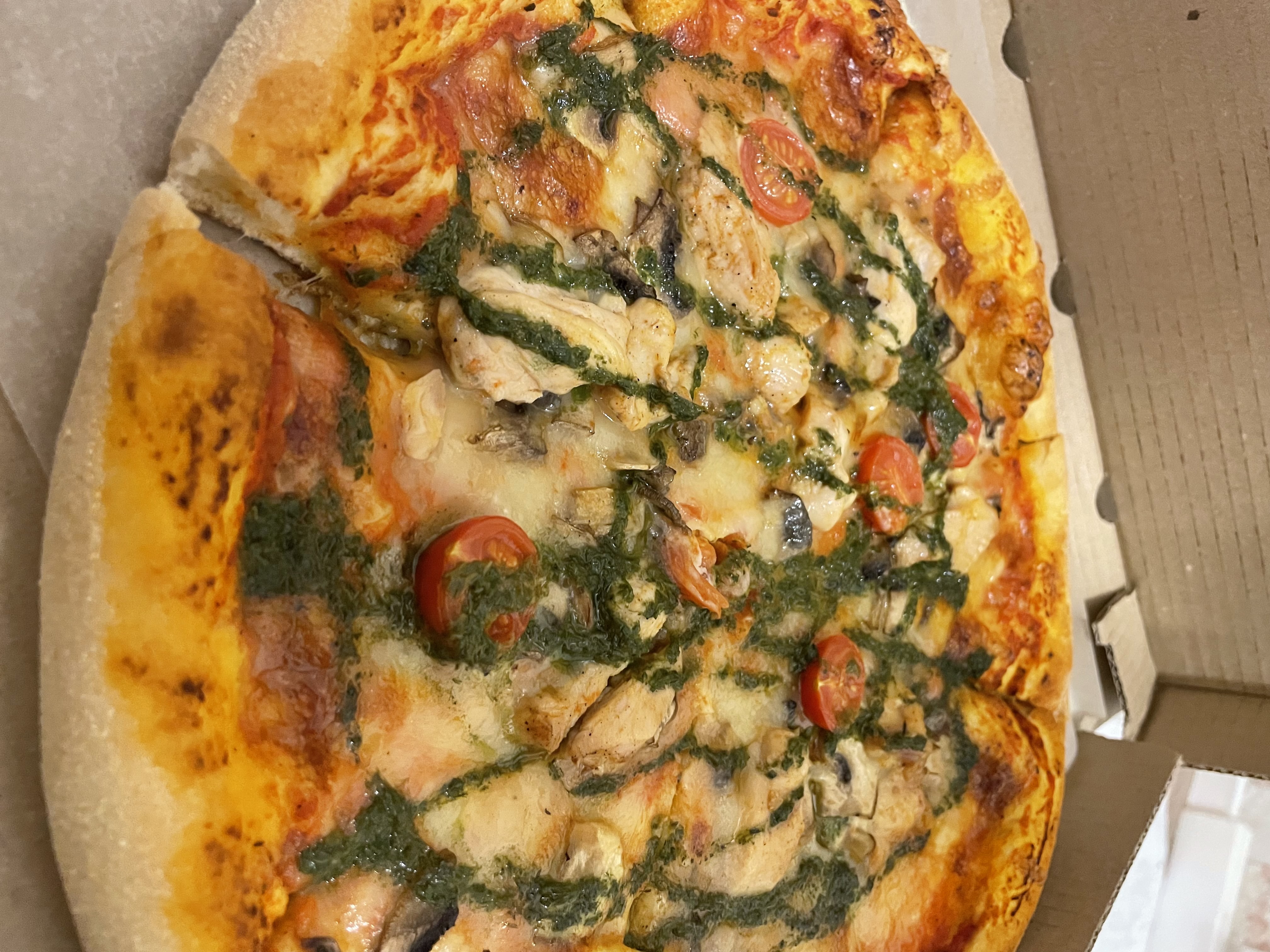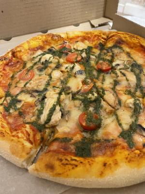 Пицца "Цыпленок с соусом песто" (630 г) 16,90 р. 26 р. Состав: фирменный соус, моцарелла, маринованное куриное филе, шампиньоны, черри, соус песто