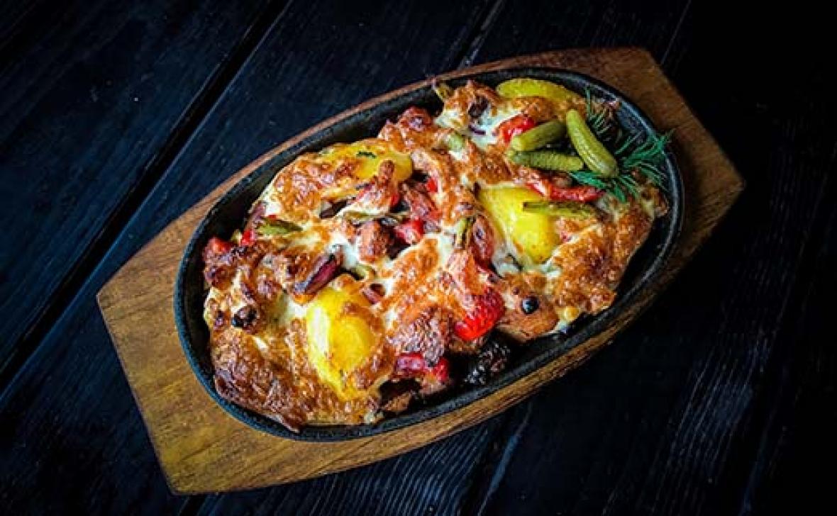 Состав: картофельные драники, куриное филе, лук репчатый, перец сладкий, сливки, зелень