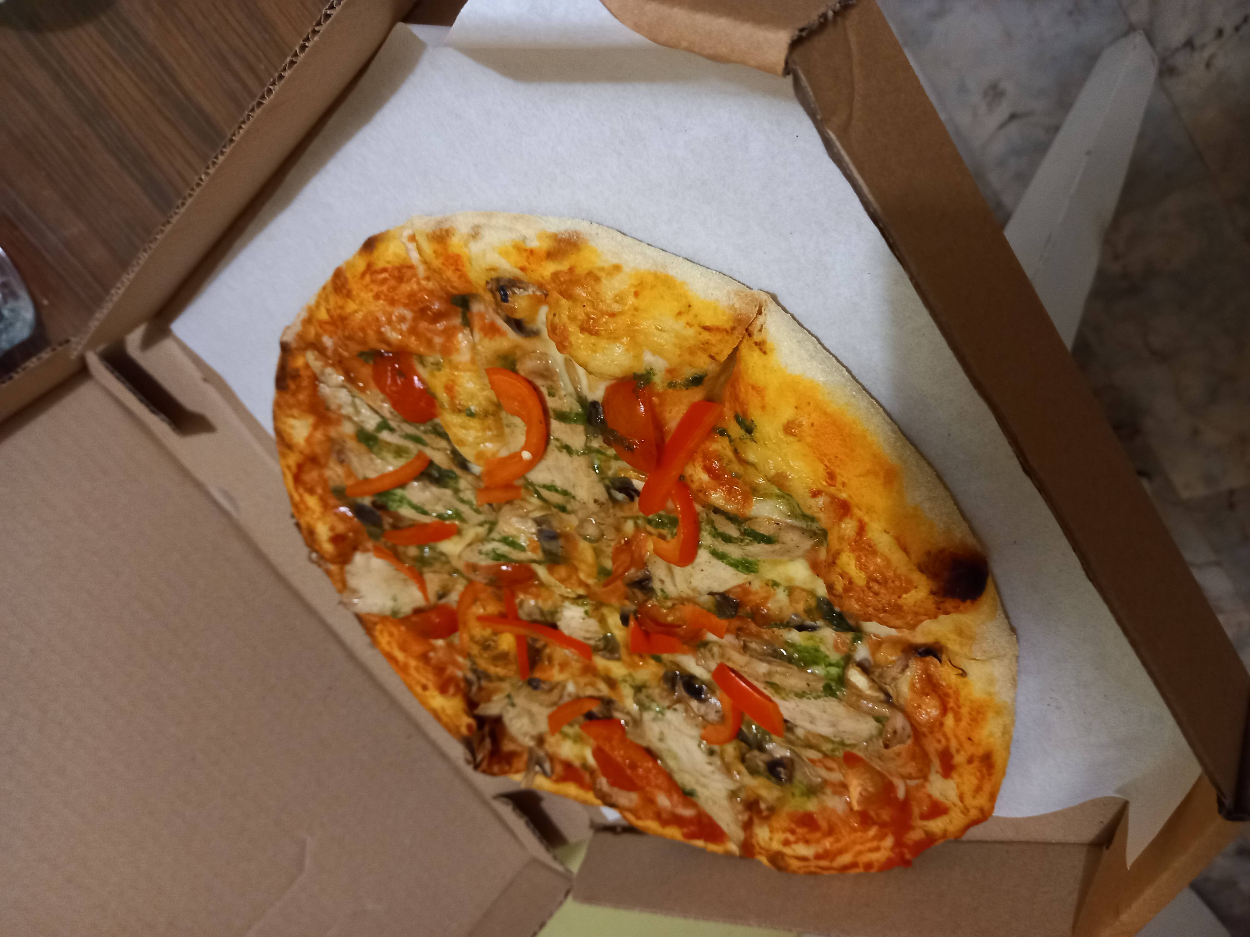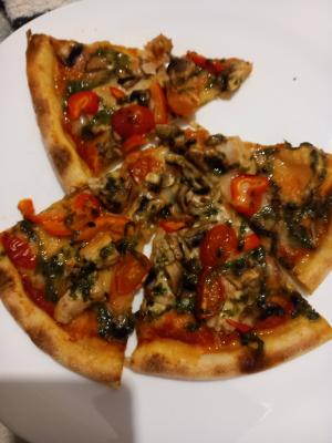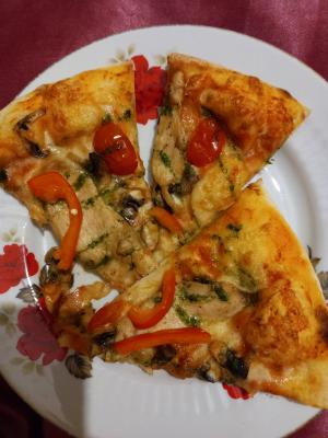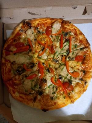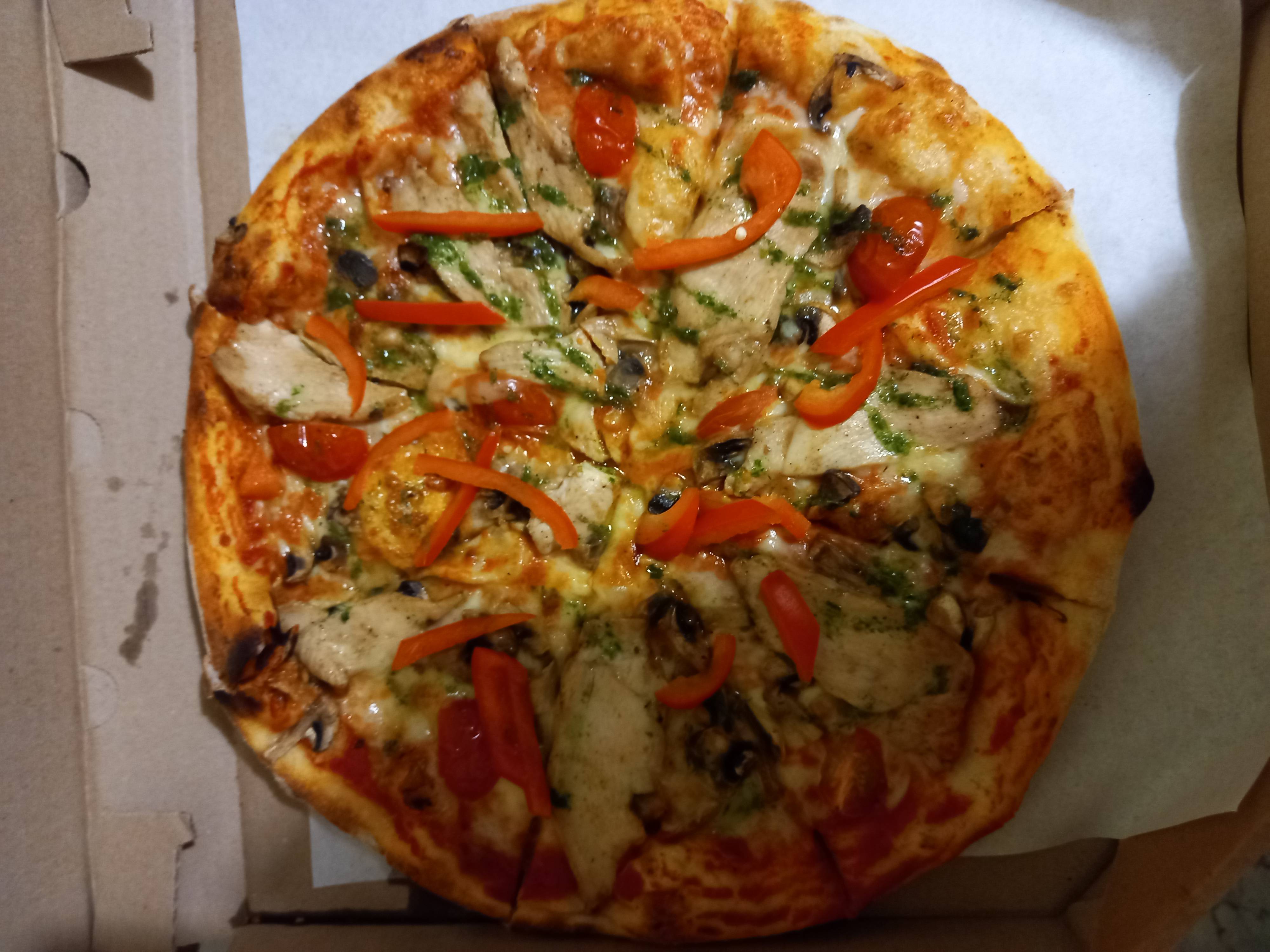 Пицца "Цыпленок с соусом песто" (630 г) 16,90 р. 26 р. Состав: фирменный соус, моцарелла, маринованное куриное филе, шампиньоны, черри, соус песто