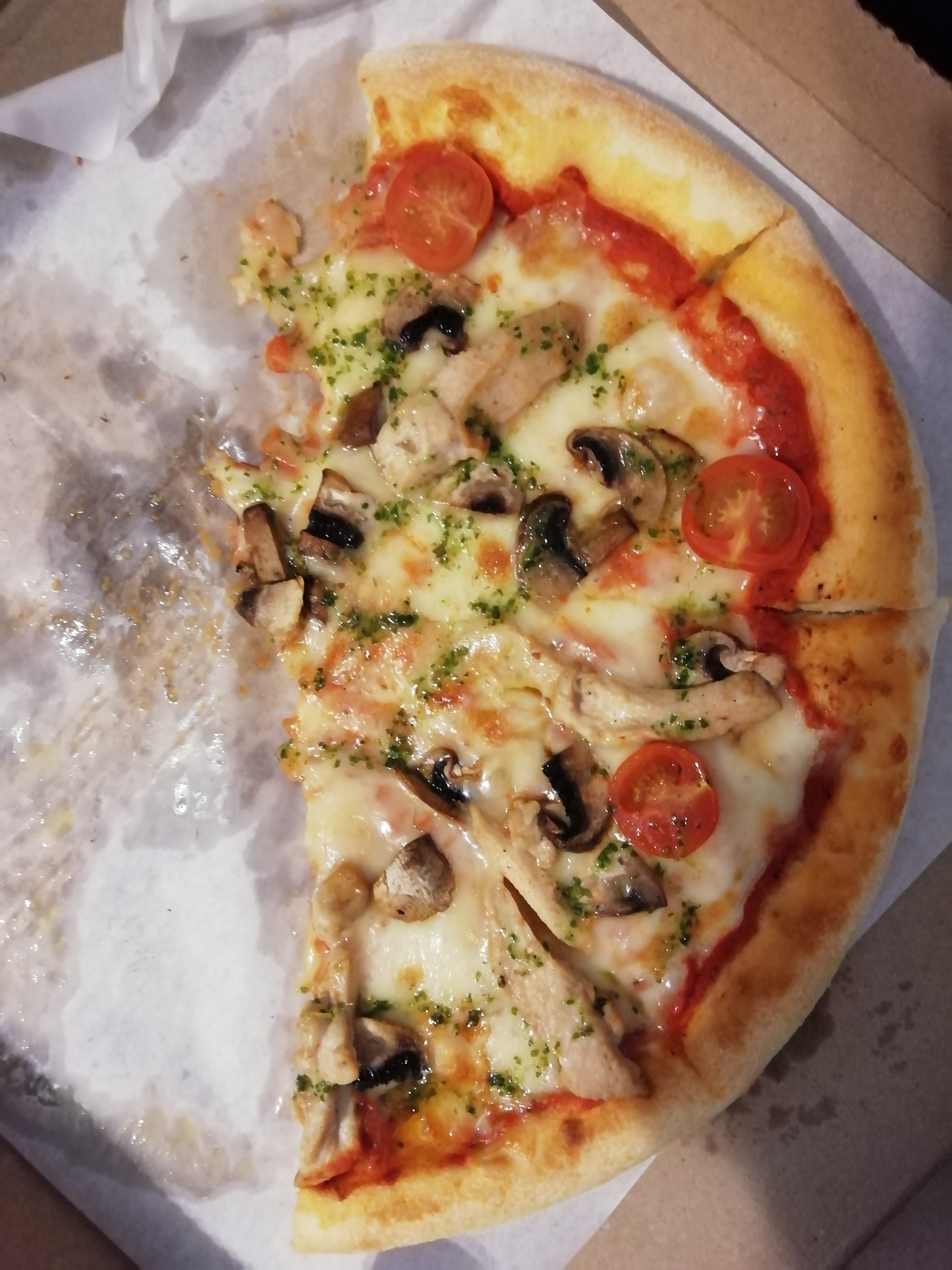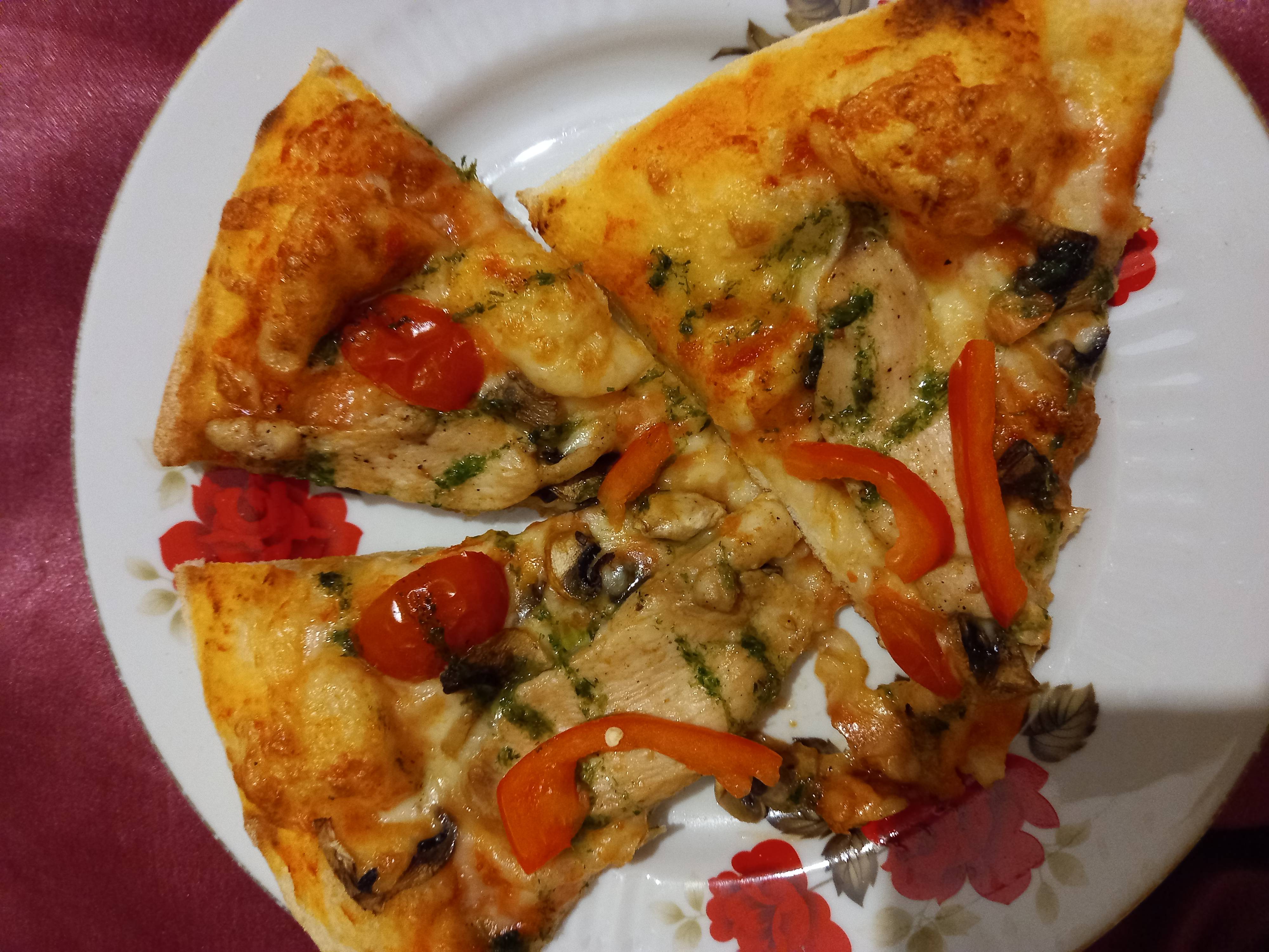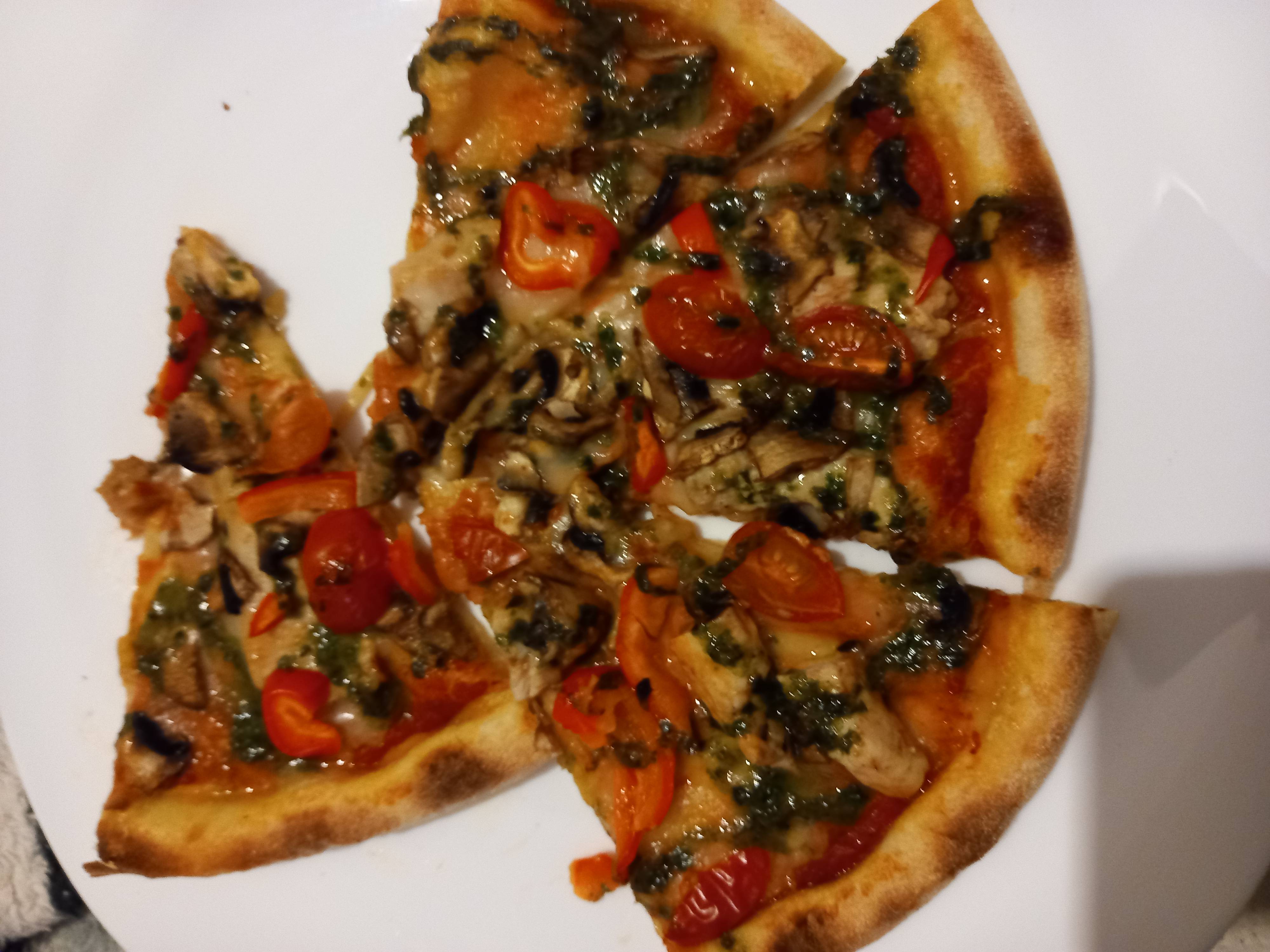 Пицца "Цыпленок с соусом песто" (630 г) 16,90 р. 26 р. Состав: фирменный соус, моцарелла, маринованное куриное филе, шампиньоны, черри, соус песто