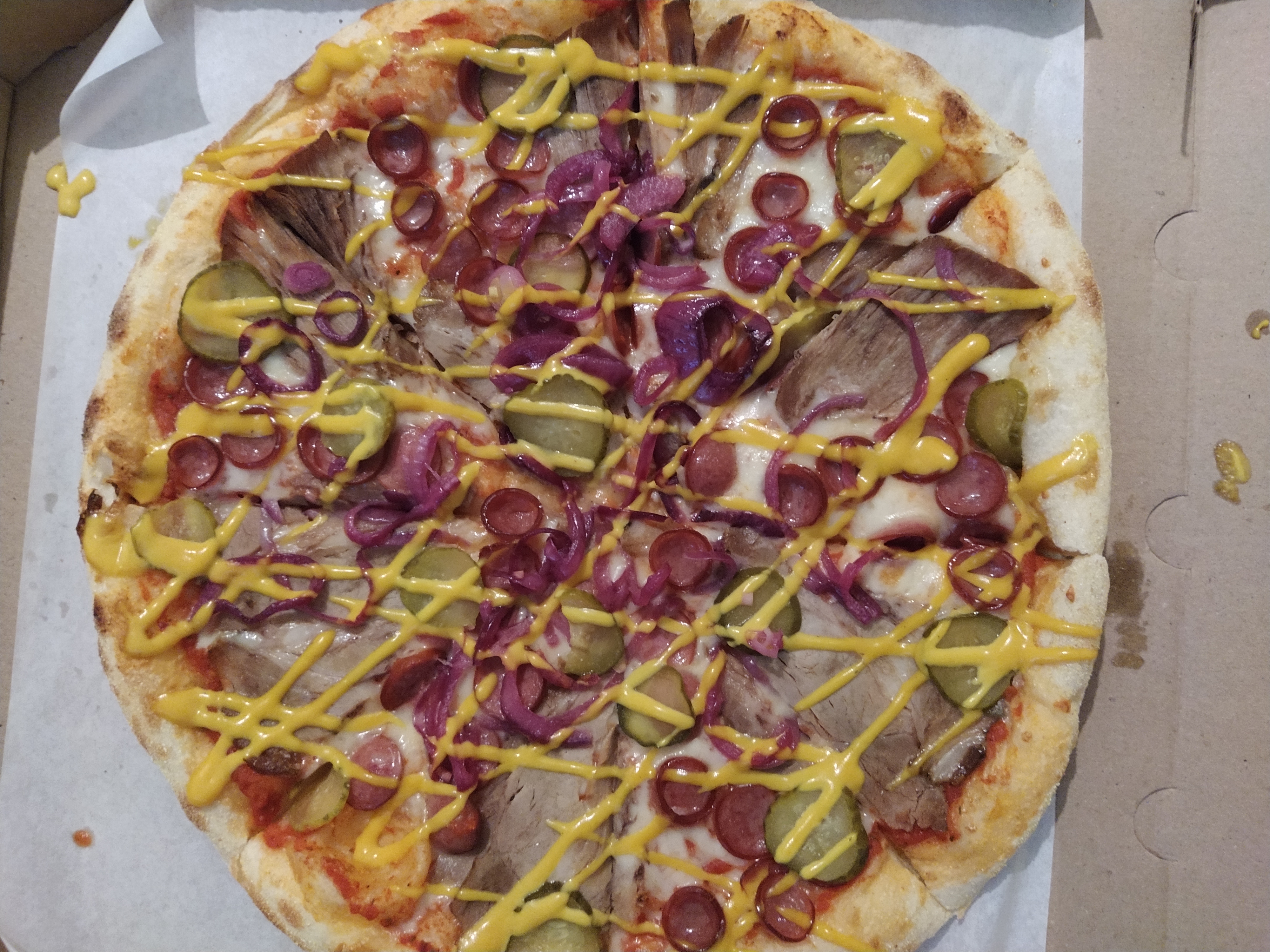 Пицца "Биф" (680 г) 16,90 р. 26 р. Состав: фирменный соус, соус бургер, моцарелла, говяжий фарш, томаты, маринованный огурец, маринованный лук, чеддер, листья салата ![]()