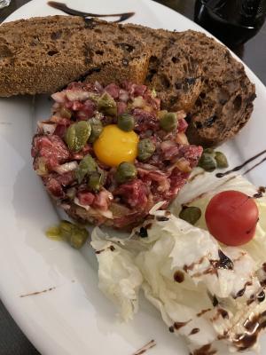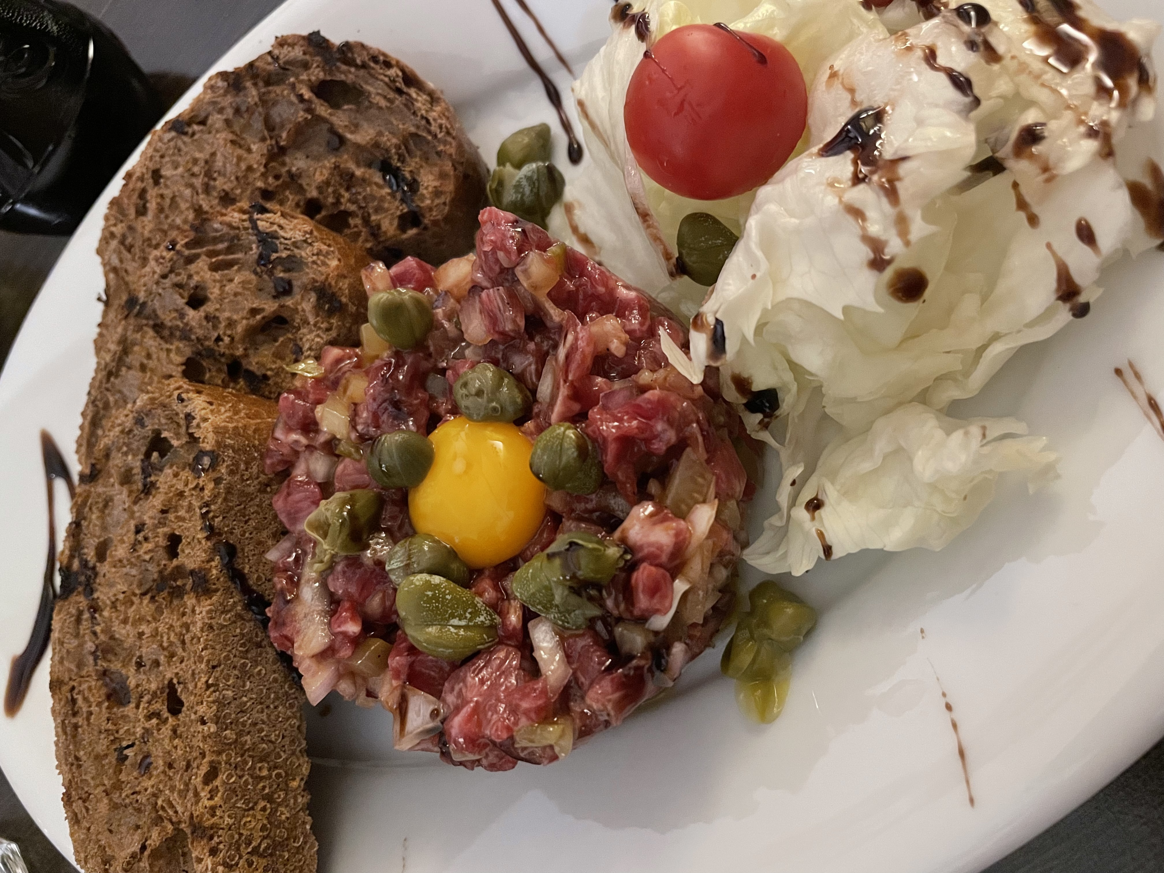 Тартар из говядины (270 г) 18,85 р. 29 р. Состав: говяжья вырезка, огурец маринованный, красный лук, каперсы, ржаные гренки, яйцо перепелиное