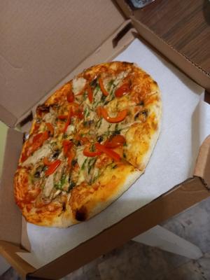 Пицца "Вега" (610 г) 13 р. 20 р. Состав: фирменный соус, моцарелла, шампиньоны, томаты, перец сладкий, жареный баклажан, лук порей ![]()