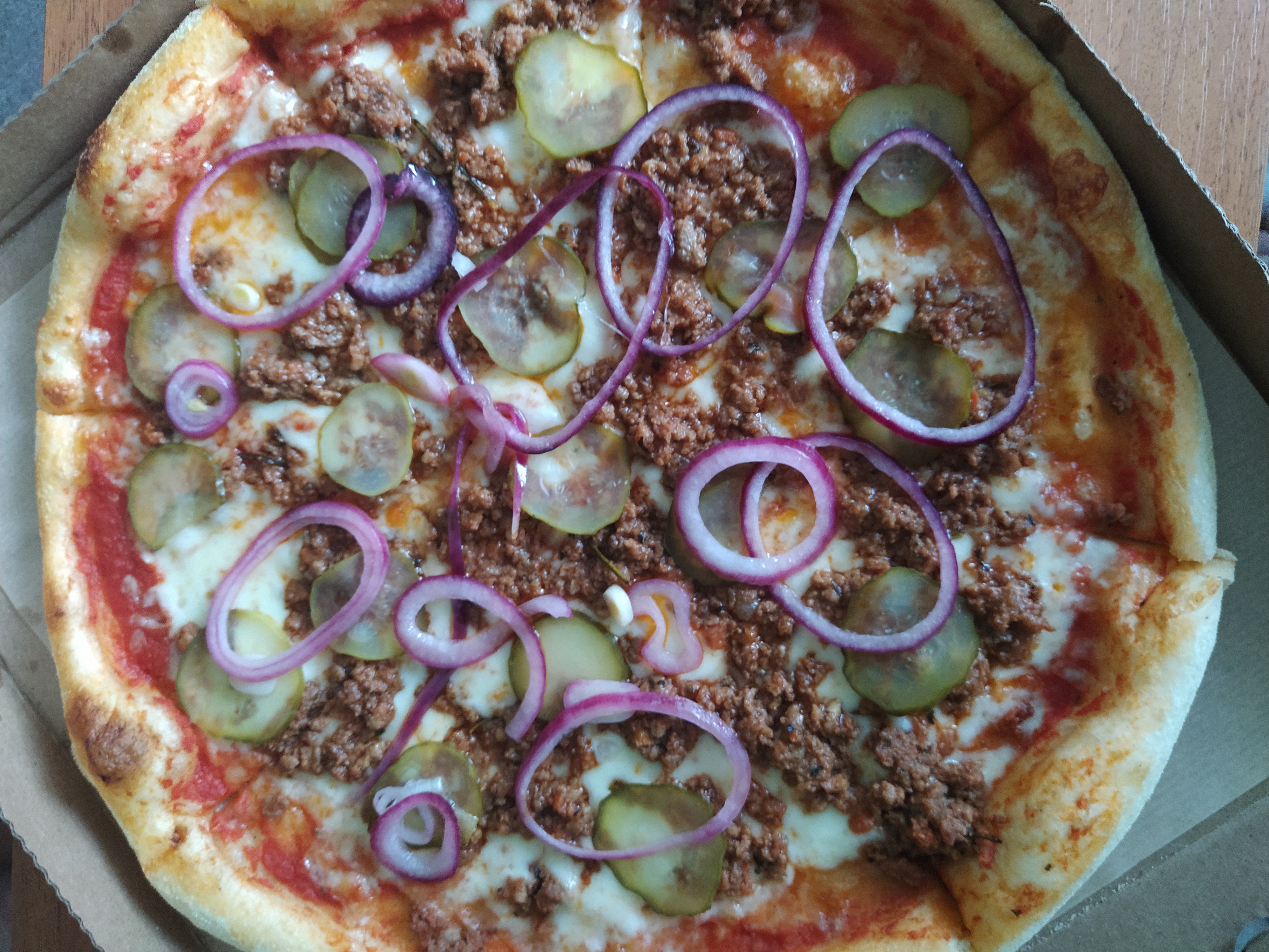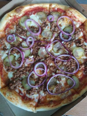 Пицца "Биф" (680 г) 16,90 р. 26 р. Состав: фирменный соус, соус бургер, моцарелла, говяжий фарш, томаты, маринованный огурец, маринованный лук, чеддер, листья салата ![]()