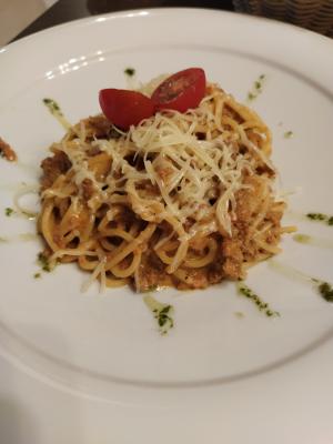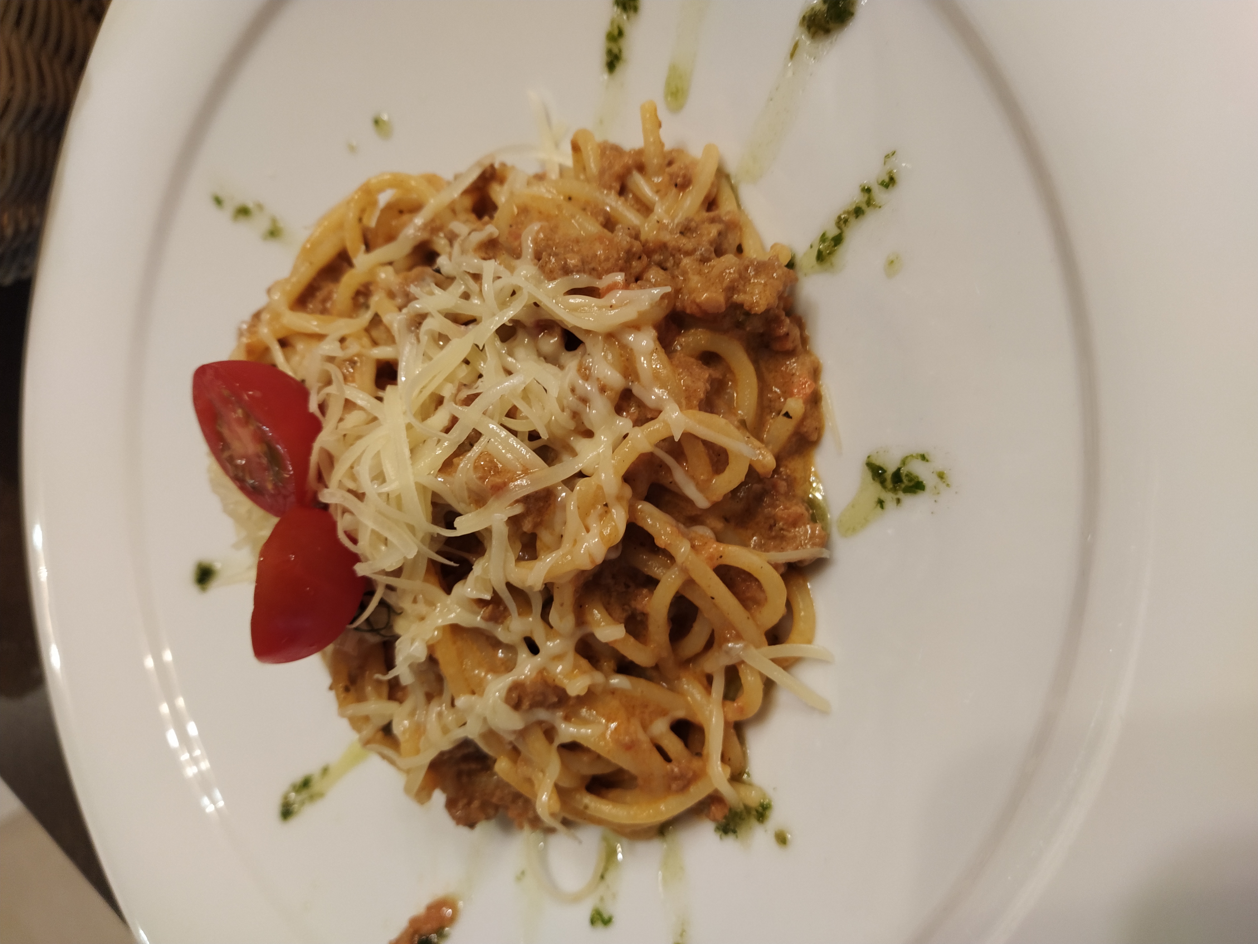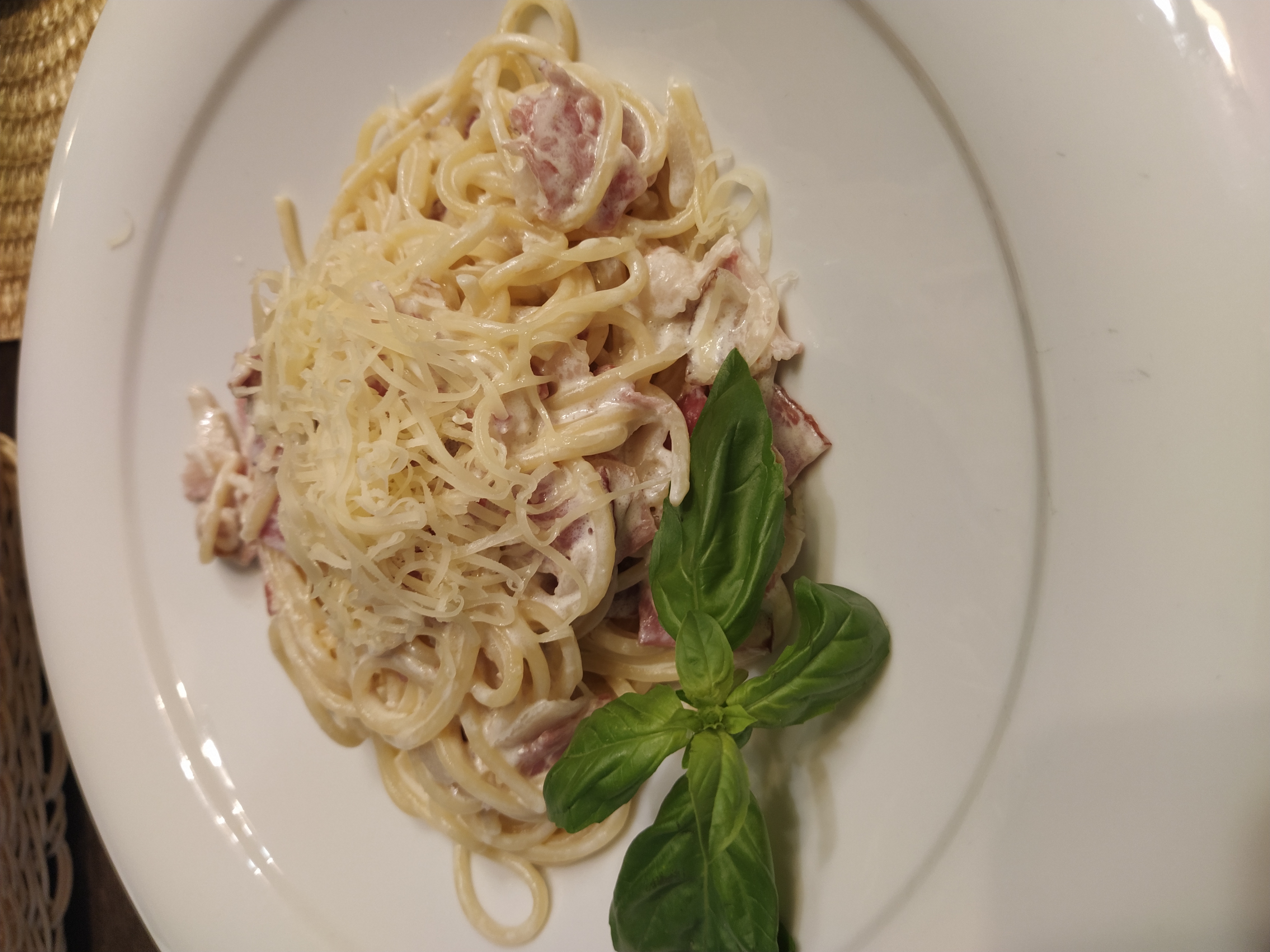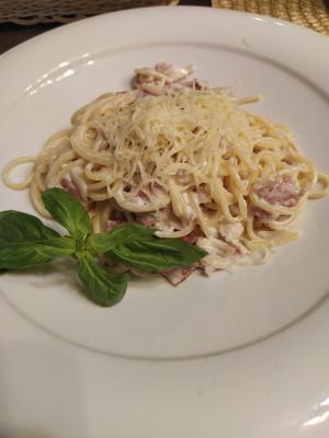 Состав: спагетти, бекон, сливки, яйцо куриное, пармезан, зелень ![]()