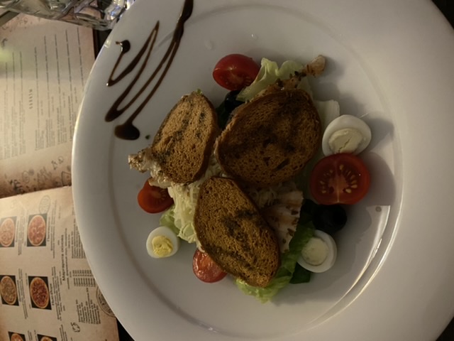 Состав: куриной филе гриль, листья салата, черри, яйцо куриное, пармезан, маслины, гренки, соус цезарь