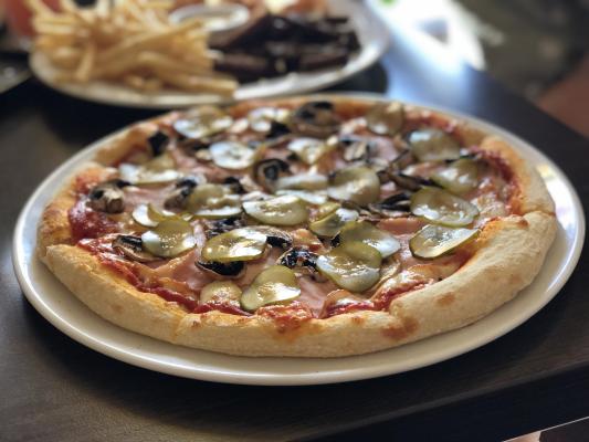 Пицца "Домашняя" (590 г) 15,60 р. 24 р. Состав: фирменный соус, моцарелла, ветчина, шампиньоны, маринованный огурец ![]()