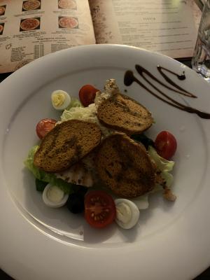 Состав: слабосоленый лосось, листья салата, черри, яйцо перепелиное, пармезан, маслины, гренки, соус цезарь |