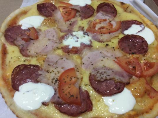 Состав: тесто, соус, сыр, грудинка копченая, колбаса в/к, соус из сметаны и чеснока, помидоры свежие, чесночный соус, орегано
