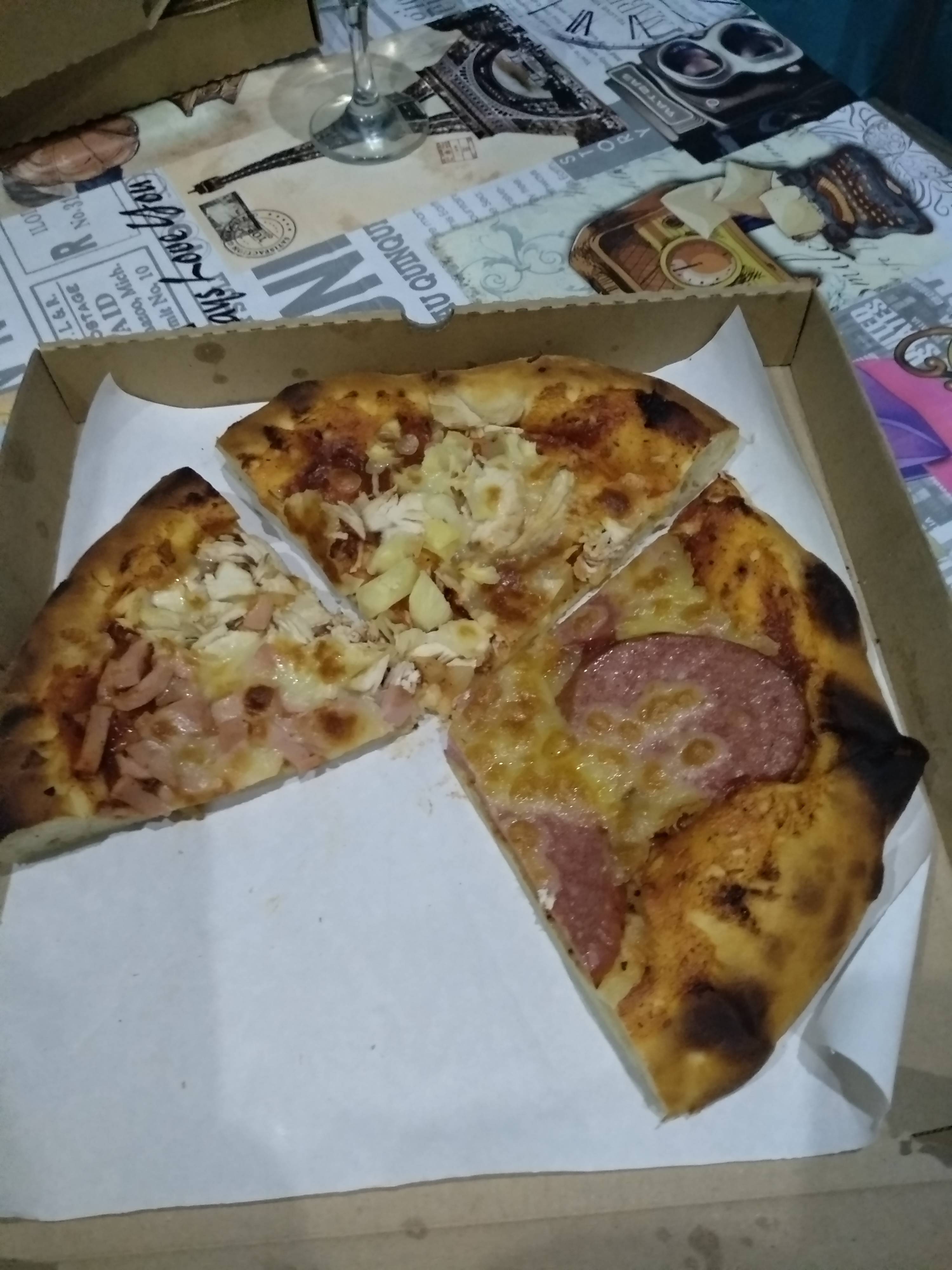Состав: тесто, томатная паста, моцарелла, курица, ананас, орегано