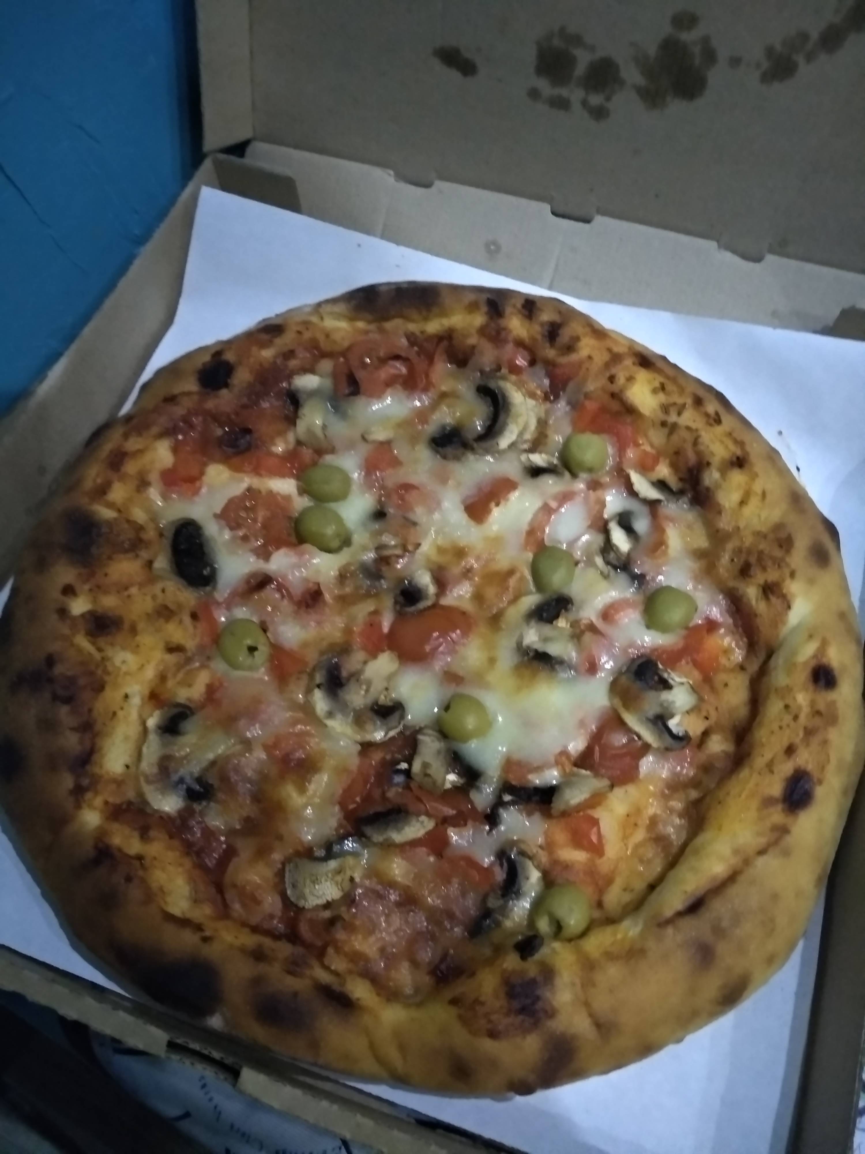 Состав: тесто, томатная паста, ветчина, оливки, моцарелла, грибы, орегано