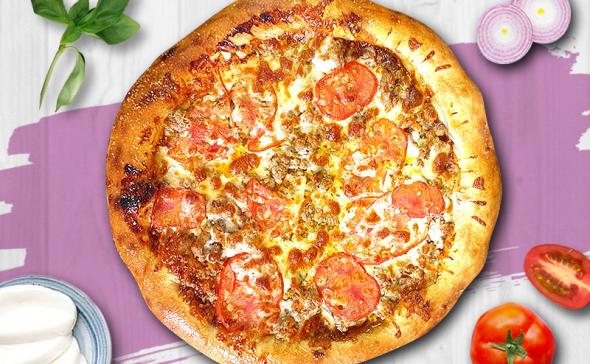 Состав: тесто, томатная паста, свинина, говядина, томаты, моцарелла, острый соус