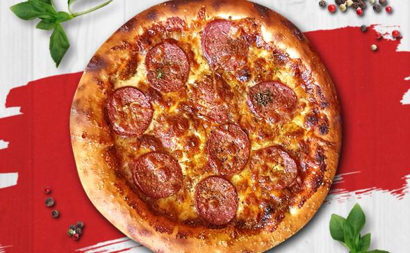 Состав: тесто, томатная паста, моцарелла, салями, халапеньо, орегано