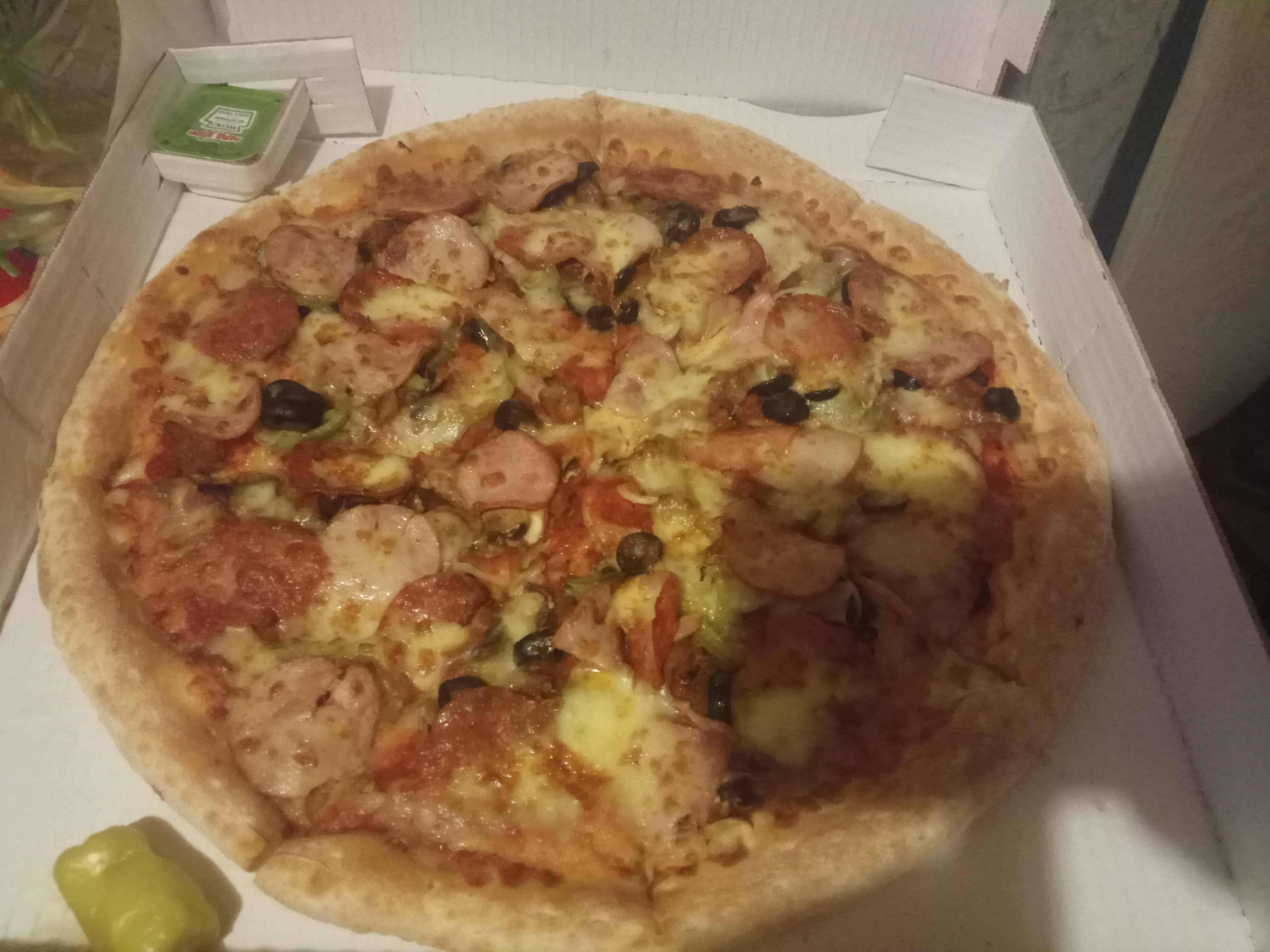 Заказывали ветчина грибы и пеперони. Пицца ни о чем, смаженка в школьной столовке. Больше не закажу у них. Тесто напоминает подошву.