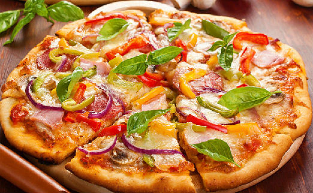 пицца с сыром Сулугуни, шампиньонами, сладким перцем, маслинами, свежим томатом, баклажанами, сыром Фета, фасолью и розмариновым маслом.