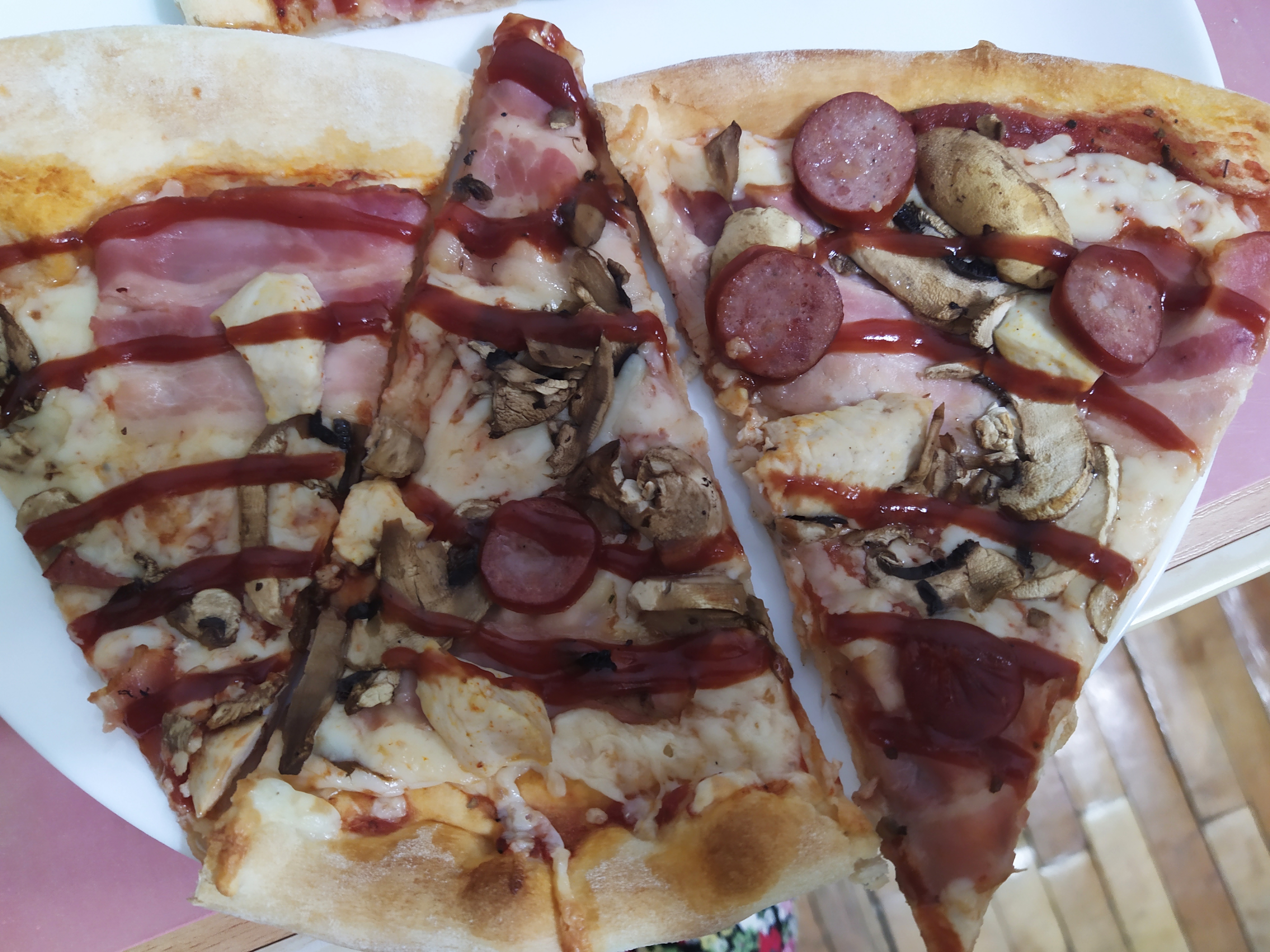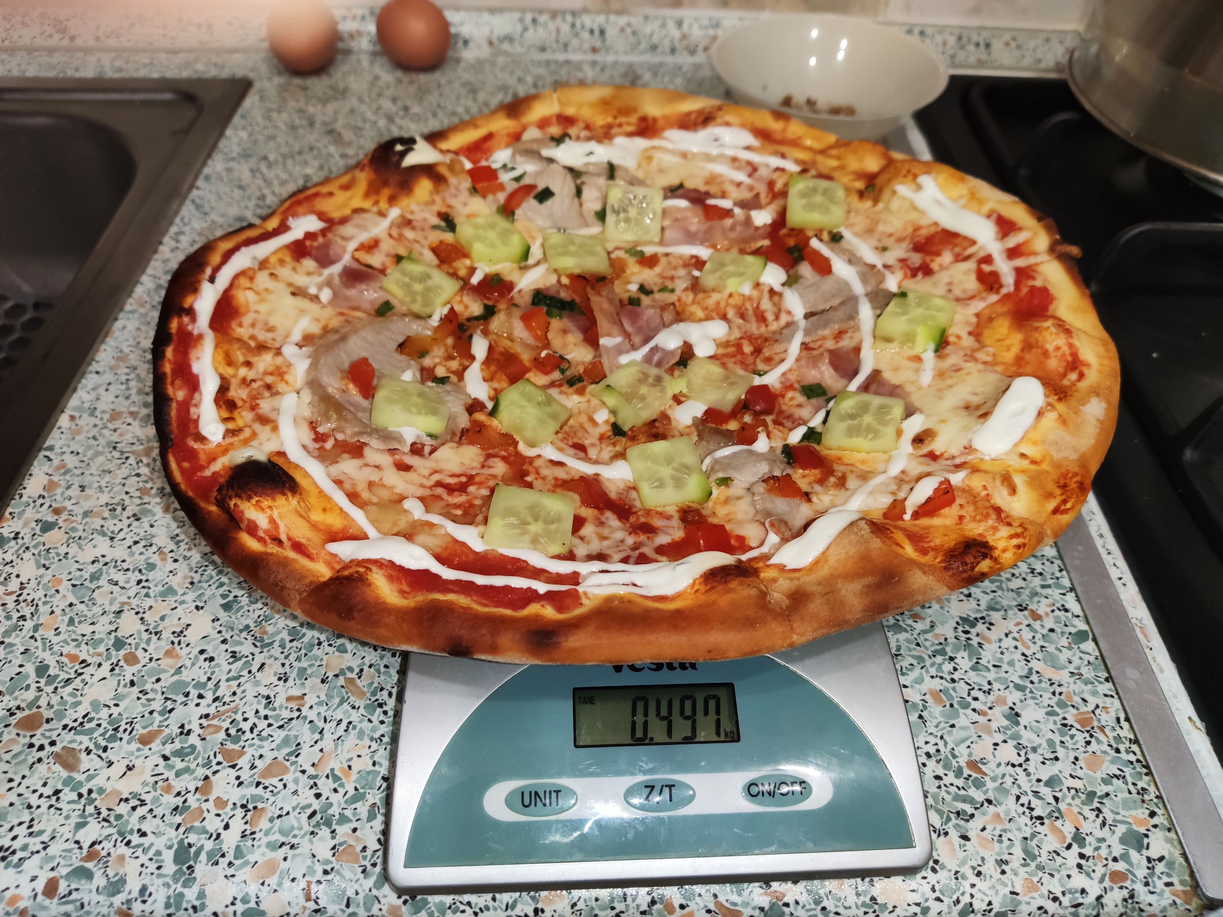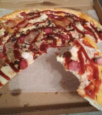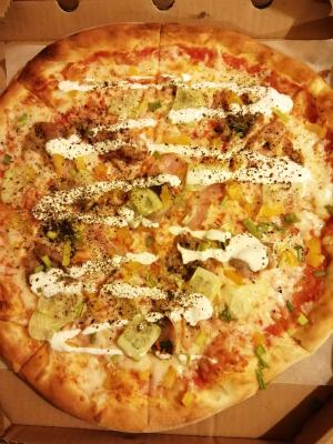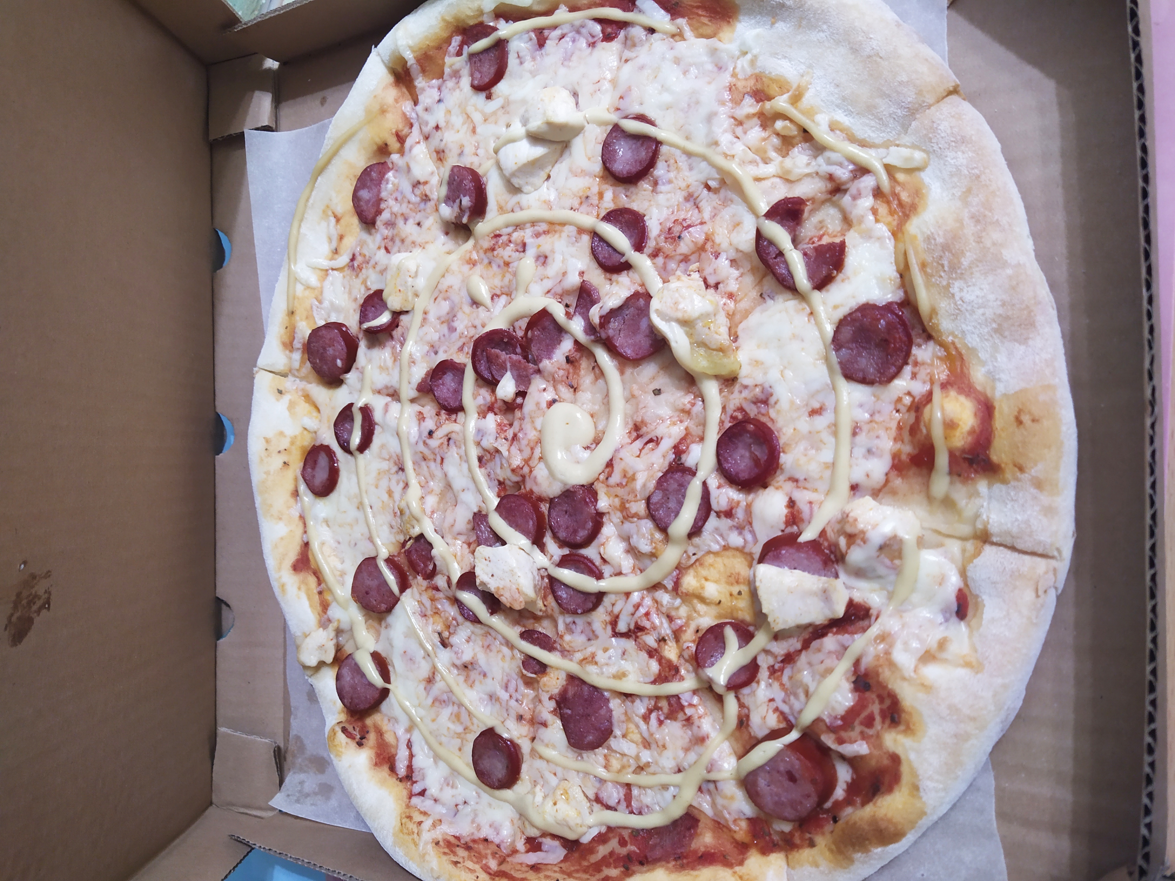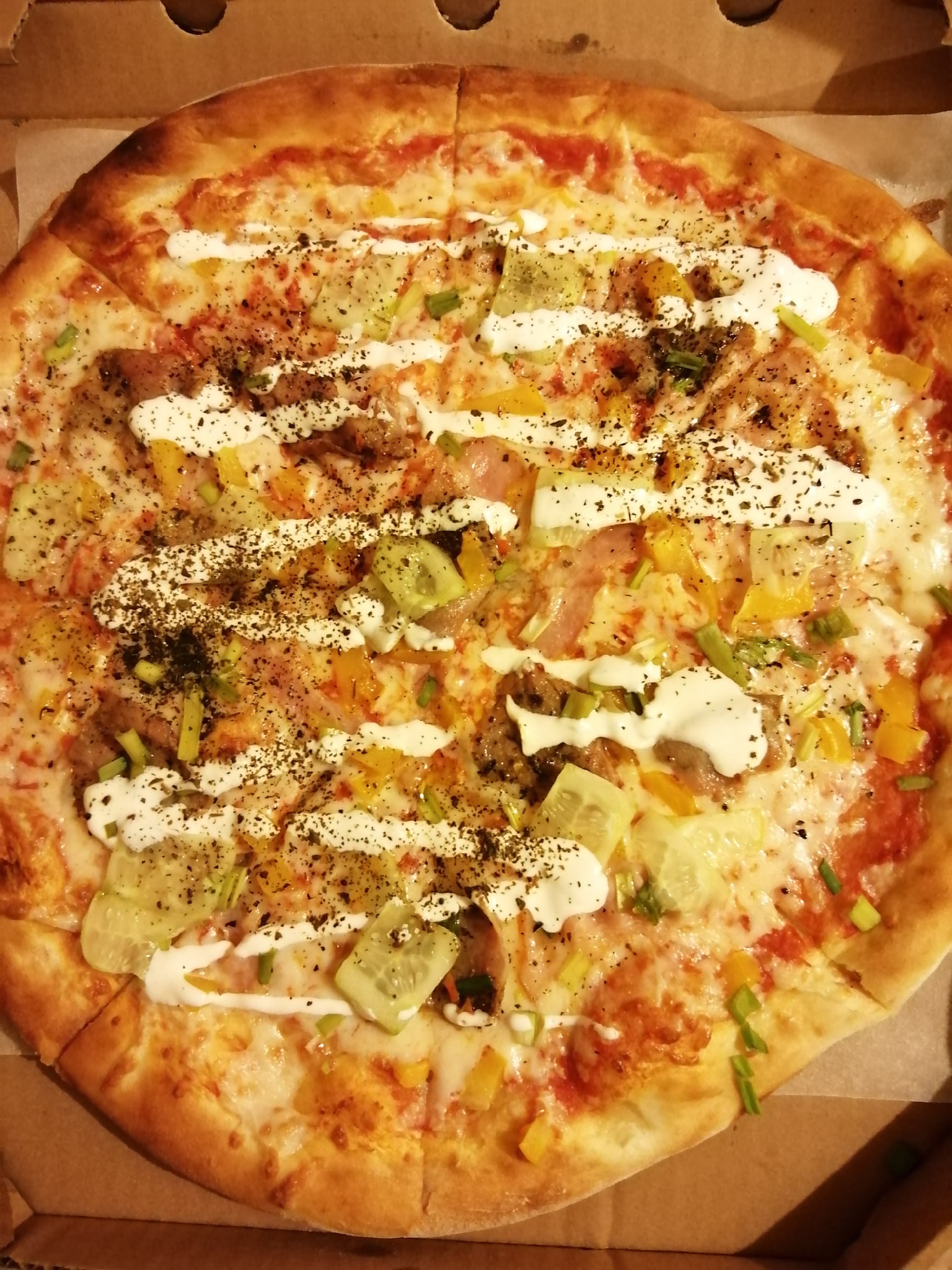 Состав: томатный соус, моцарелла, ветчина, куриное филе, шампиньоны, маринованный огурец, соус майонезно-чесночный.