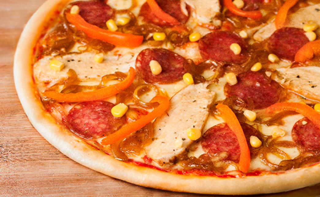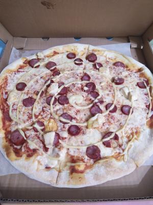 - Баварская (Состав: томатный соус, моцарелла, куриное филе, охотничьи колбаски, соус горчичный)