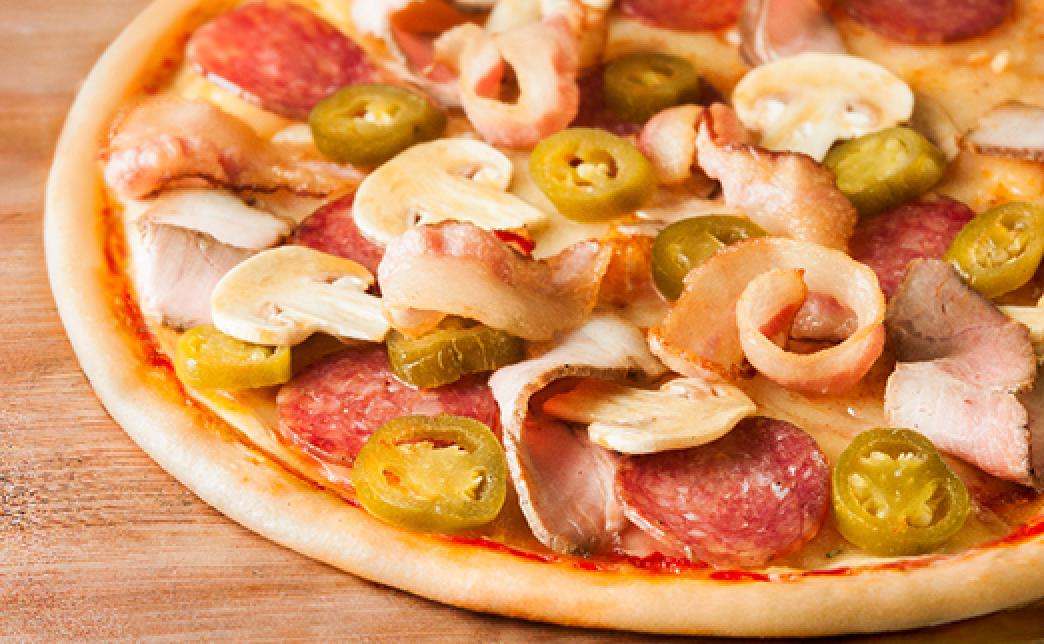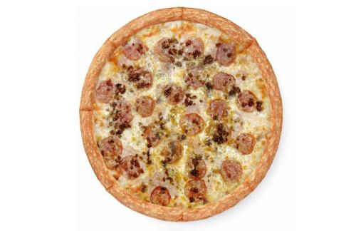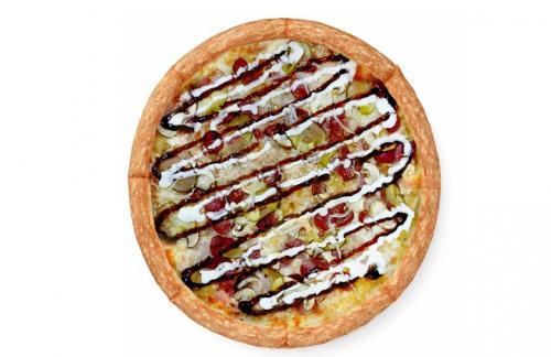 Состав: томатный соус, моцарелла, свинина, бекон, маринованный лук, соус барбекю.