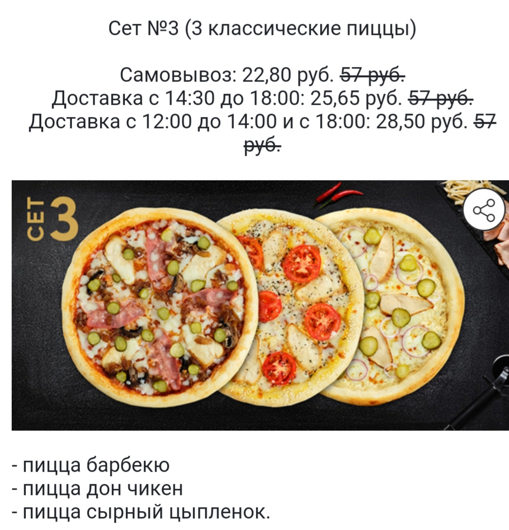 - Стоимость пицц: от 16,80 р. от 24 р.