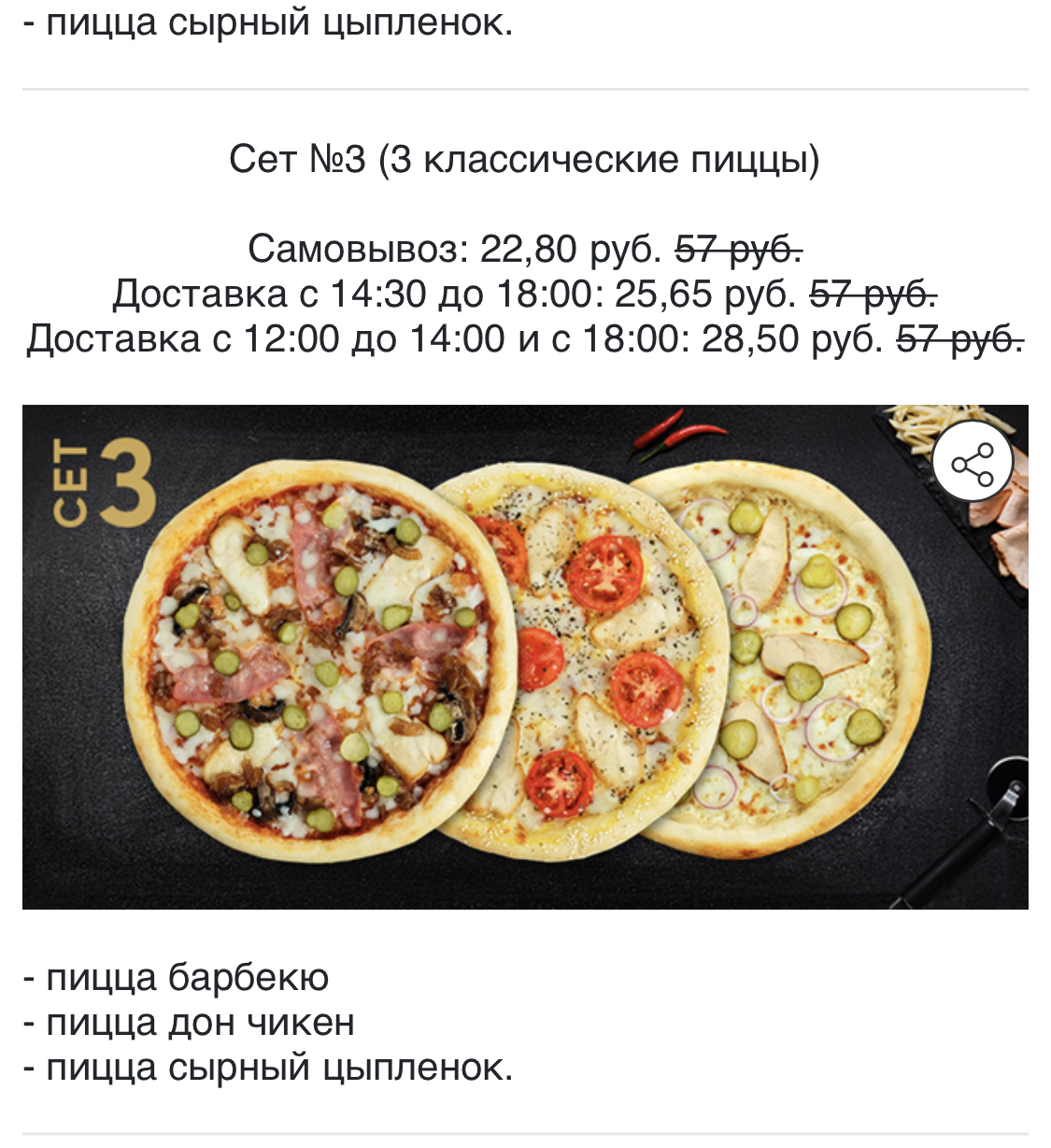 - Стоимость пицц: от 16,80 р. от 24 р.