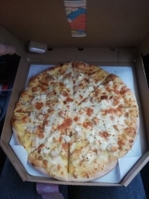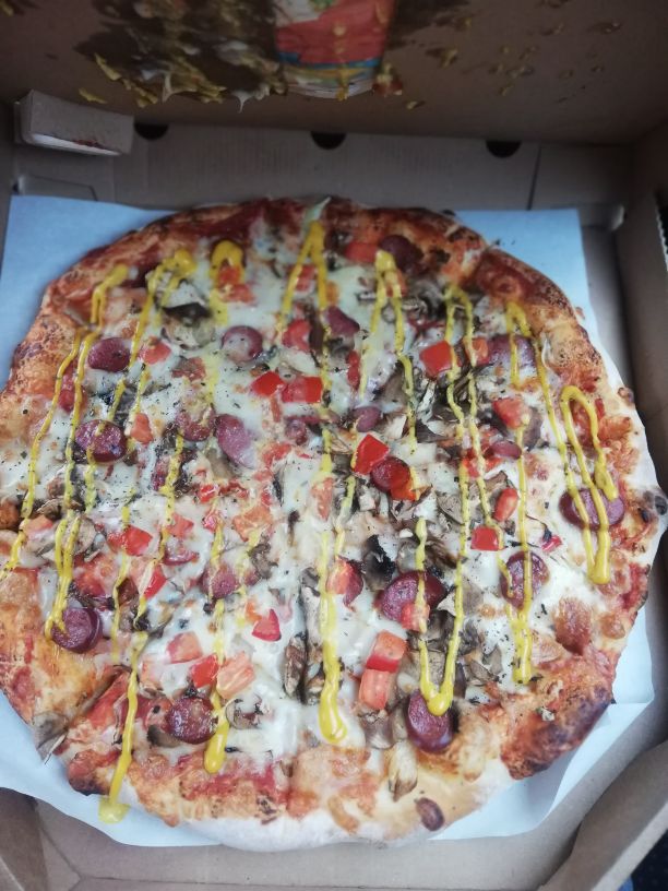 Состав: соус барбекю, сыр моцарелла, куриное филе, охотничьи колбаски, шампиньоны, лук, базилик, горчица