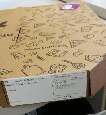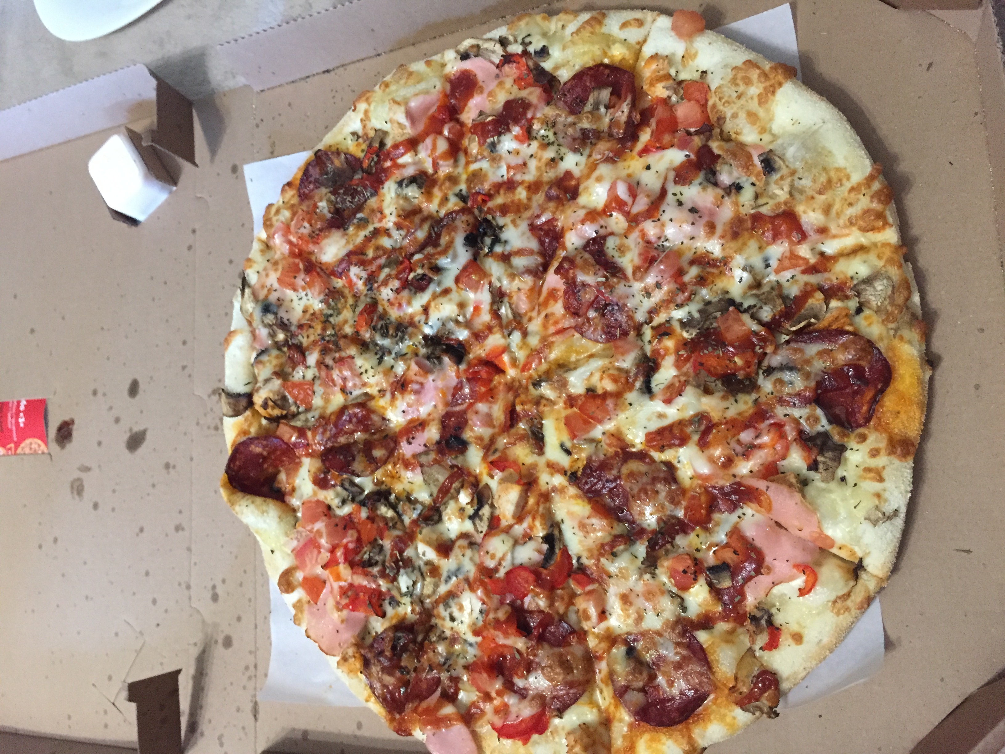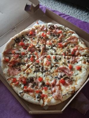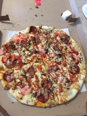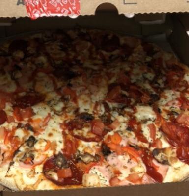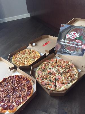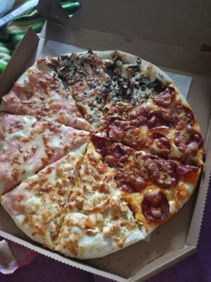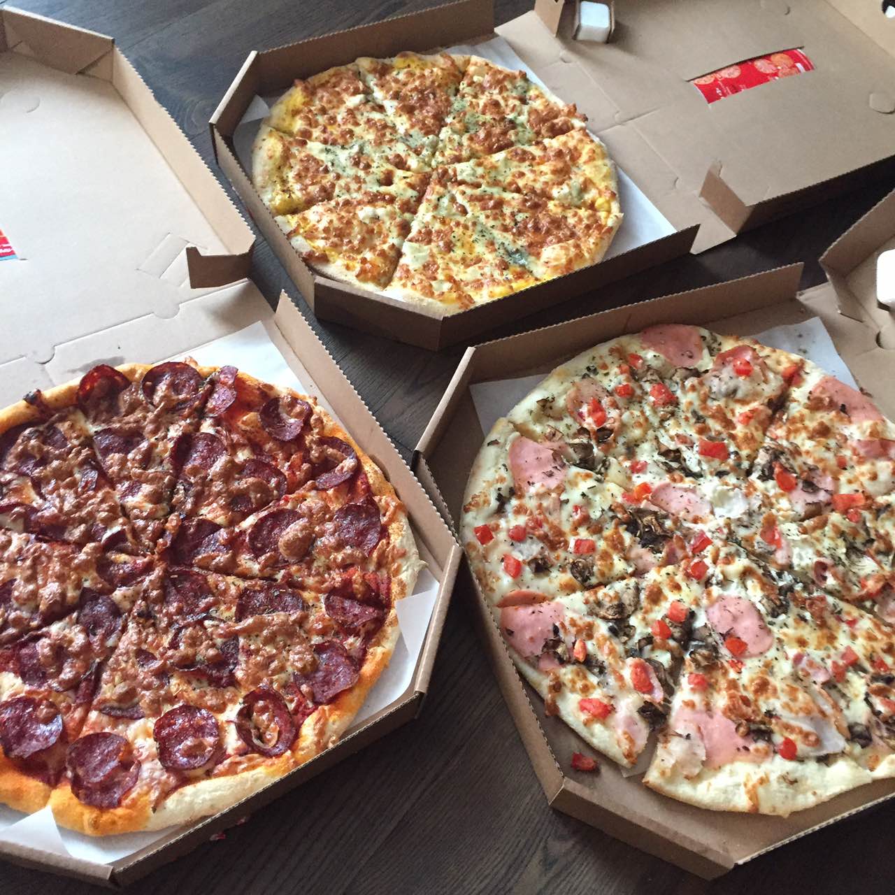 Заказывали 6 больших пицц в офис на ДР сотрудника. Курьер опоздал на 10 мин., за это одну пиццу отдали бесплатно. Сами пиццы были очень вкусные, большие и много начинки.  Всем понравилось. Спасибо вам большое.