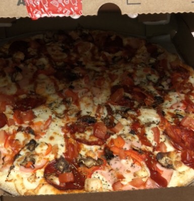 Пицца вкусная. Начинки больше чем в пицце другой компании, всех покорила американская. Брали боварскую тоже вкусная, а вот 4 сезона так себе. И где есть в пицце грибы они сухие. Брали большие( 800-900г) они действительно большие и ими наедаешься. Мы брали по акции 2 кода-6 пицц на 5взрослых и 5 детей, у нас 2'5 пиццы остались на утро. Единственный минус курьеру., если в заметках указано позвонить за 5 мин. До приезда-позвоните и ещё куръер мог быть повежливее.