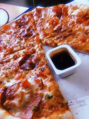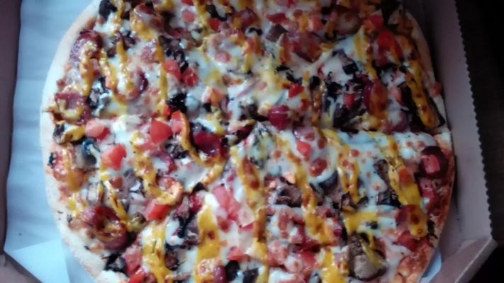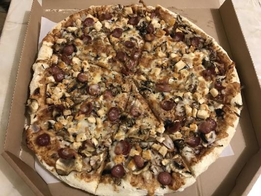 Брали по акции 3 пиццы. Начинки много и до краев, сытно, очень напоминает созвучную :) Если вы такое любите, вам понравится. Нам все таки тесто не очень (но это субъективно, потому не убираю звезды).